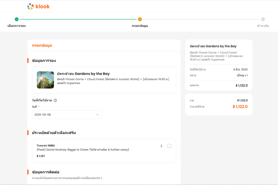 Klook เหมาะกับคนที่อยากได้ความยืดหยุ่นเรื่องวันเข้า เพราะหน้าสินค้าระบุว่าเป็น การจองแบบเปิด (open-dated) ใช้เข้าวันที่ต้องการได้ภายในช่วงอายุบัตรที่ระบุบนตั๋ว และโดยทั่วไป ไม่ต้องจองรอบล่วงหน้า แค่แสดงบัตรภายในช่วงเวลาที่ใช้ได้ก็เข้าได้ นอกจากนี้ Klook ยังระบุชัดว่า ถ้าซื้อแพ็ก Flower Dome + Cloud Forest จะต้องเข้าทั้งสองแห่ง ภายในวันเดียวกัน ไม่สามารถแยกคนละวันได้