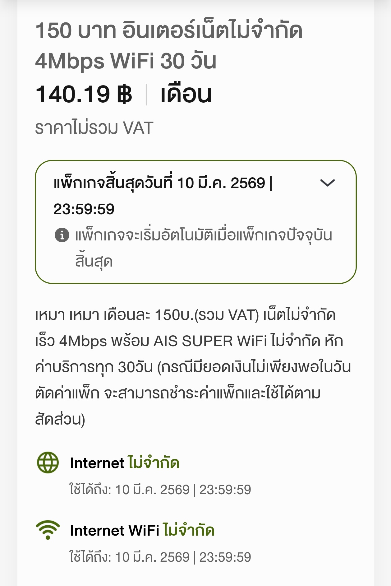 ตอนนี้ใช้แพ็คเน็ต คุณเริ่มใช้เหมา เหมา เดือนละ 150บ.(รวมภาษีมูลค่าเพิ่ม) เน็ตเร็ว 4Mbps 100GB จากนั้นเร็ว 384Kbps และ AIS SUPER WiFi ไม