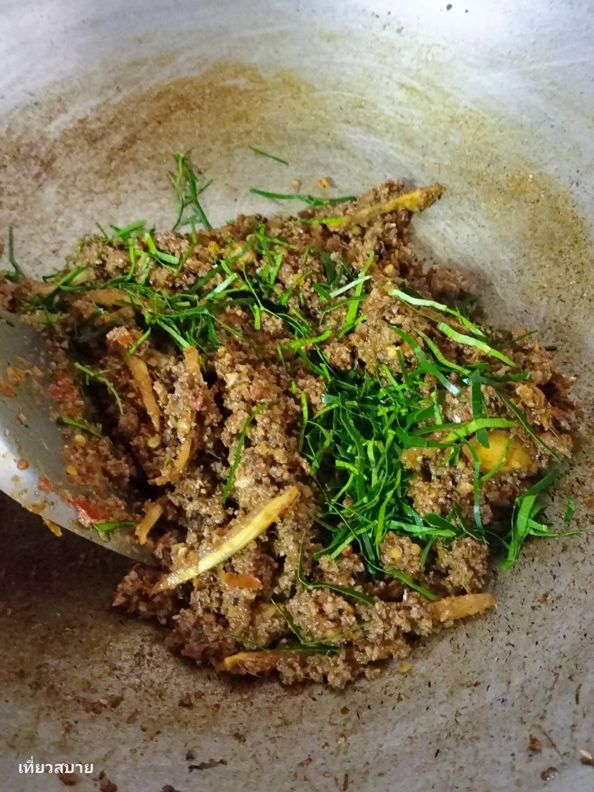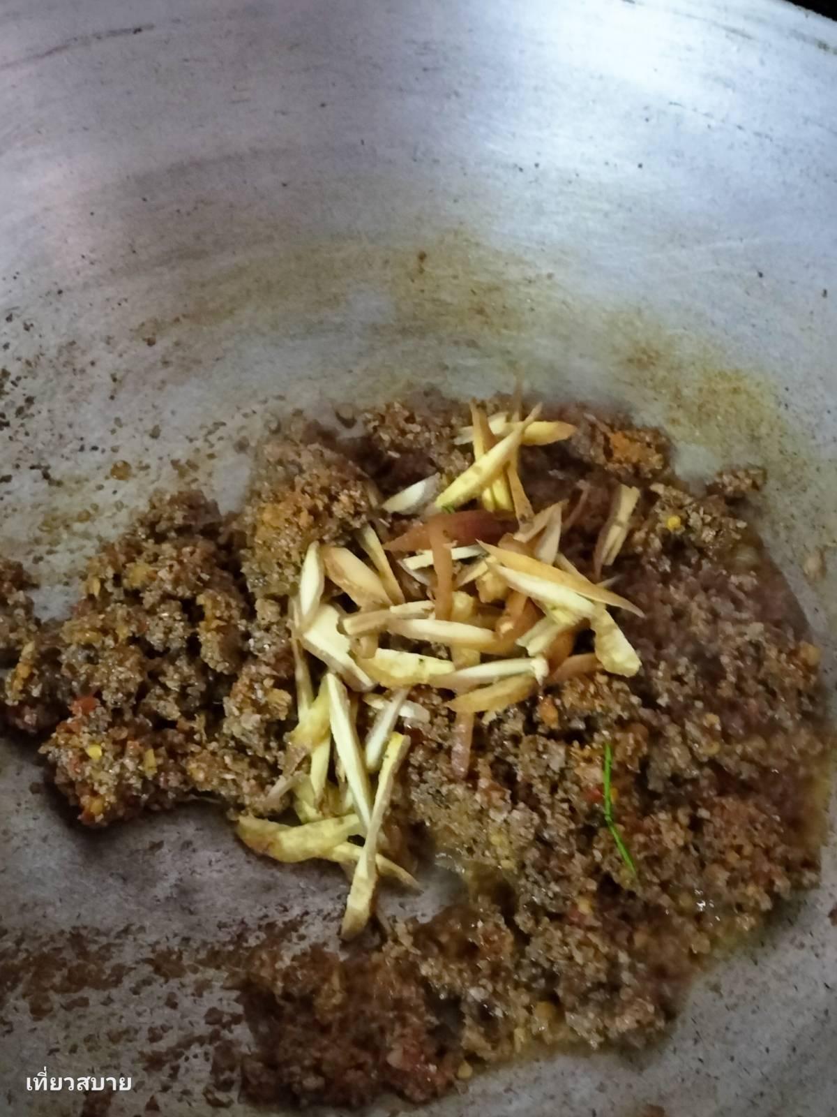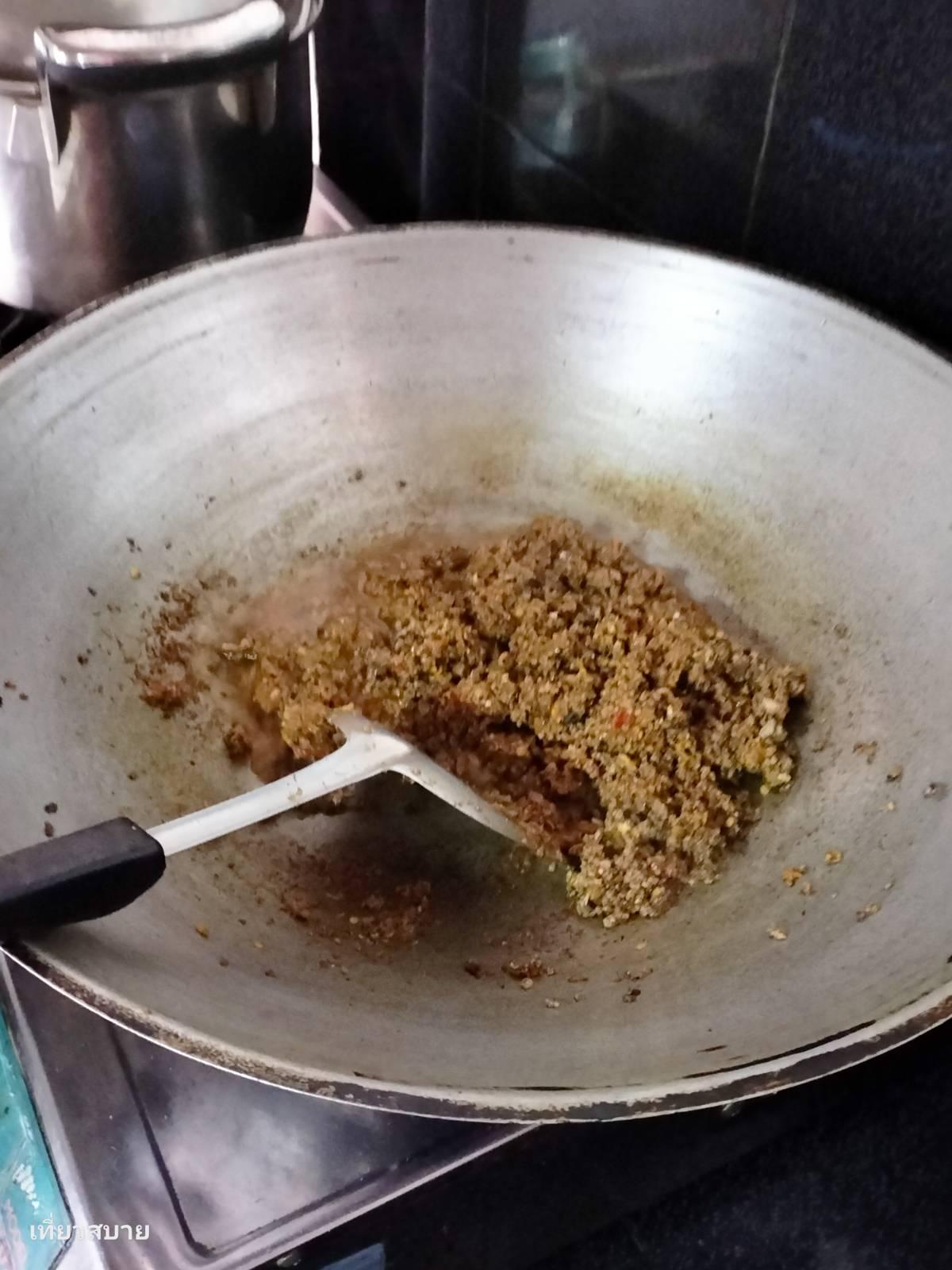 2. จากนั้นใส่ หนูนาที่สับละเอียดไว้ลงไปผัด ให้เครื่องแกงคลุกเคล้ากับเนื้อให้ทั่ว
