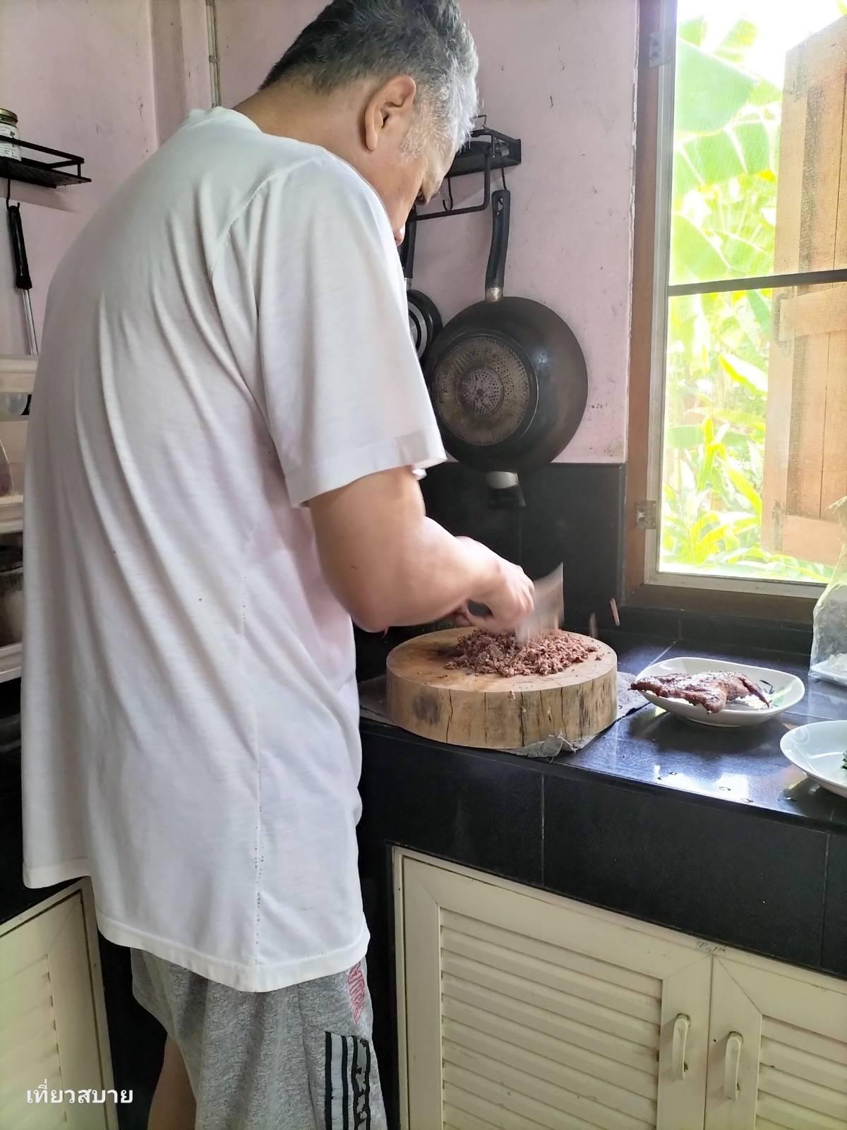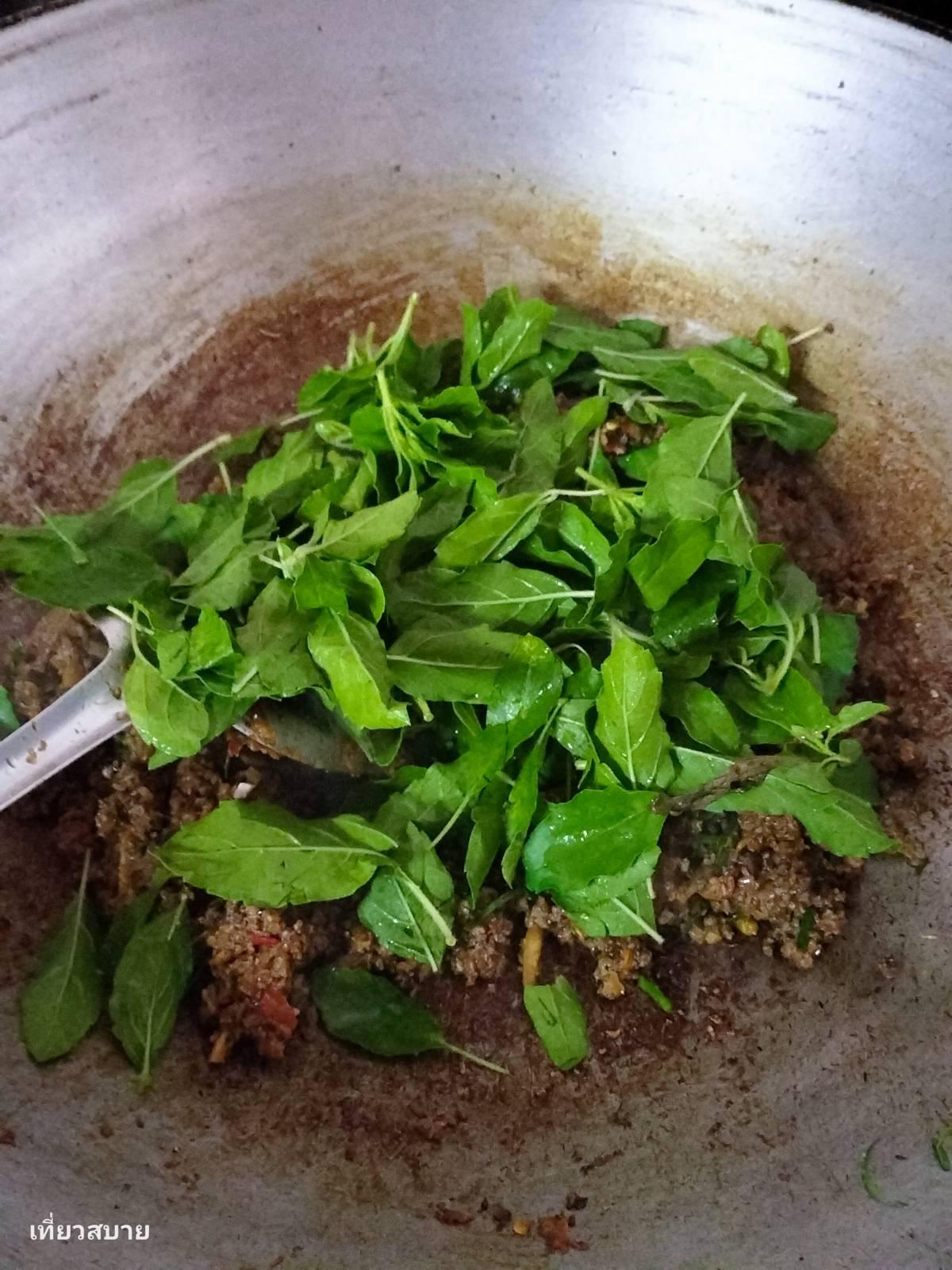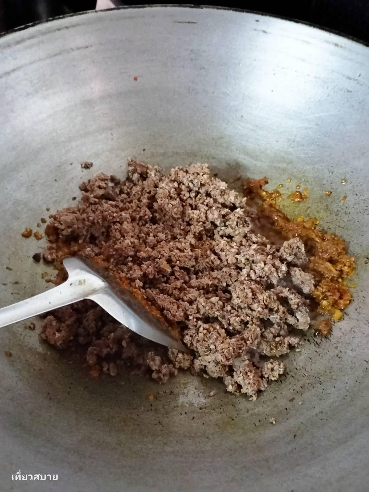 2. จากนั้นใส่ หนูนาที่สับละเอียดไว้ลงไปผัด ให้เครื่องแกงคลุกเคล้ากับเนื้อให้ทั่ว