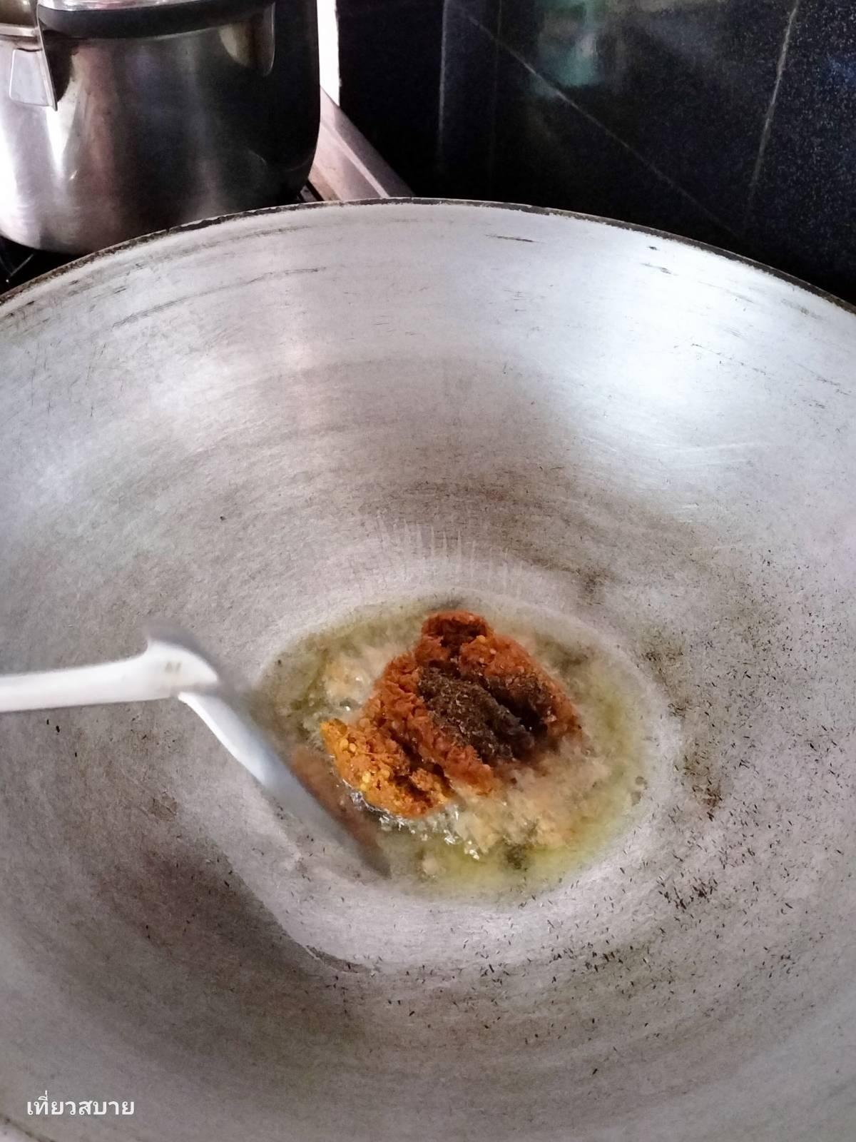 จากนั้นใส่ พริกแกงป่าลงไปผัดก่อน แล้วใส่เครื่องเทศลงไปผัดตาม ขั้นตอนนี้กลิ่นเครื่องเทศจะหอมมากค่ะ