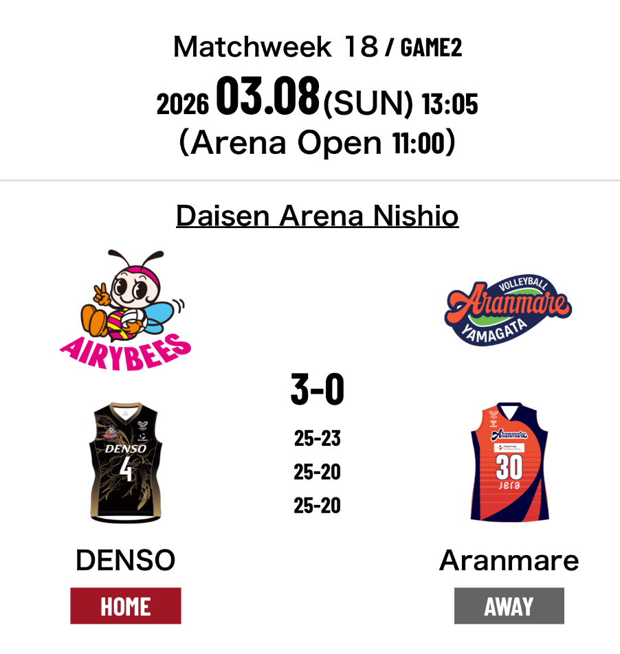 1.Denso Airybees 3-0 Aranmar Yamagata (25-23 25-20 25-20)