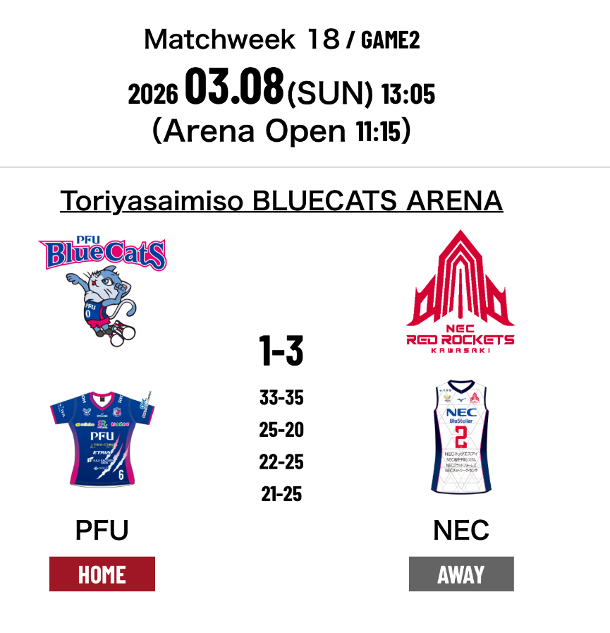2.PFU Blue Cats 1-3 NEC Red Rockets Kawasaki (33-35 25-20 22-25 21-25)