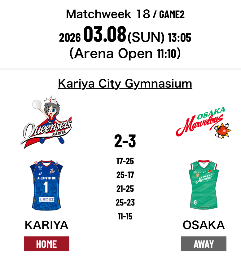3.Queenseis Kariya 2-3 Osaka Marvelous (17-25 25-17 21-25 25-23 11-15)