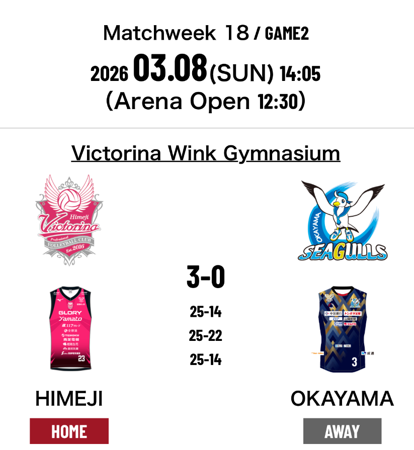 4.Victorina Himeji 3-0 Okayama Seagulls (25-14 25-22 25-14)