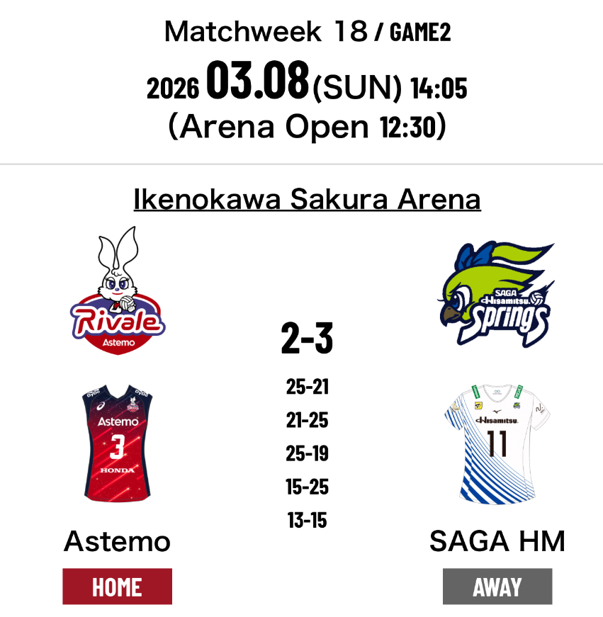 5.Astemo Rivale Ibaraki 2-3 SAGA Hisamitsu Springs (25-21 21-25 25-19 15-25 13-15)