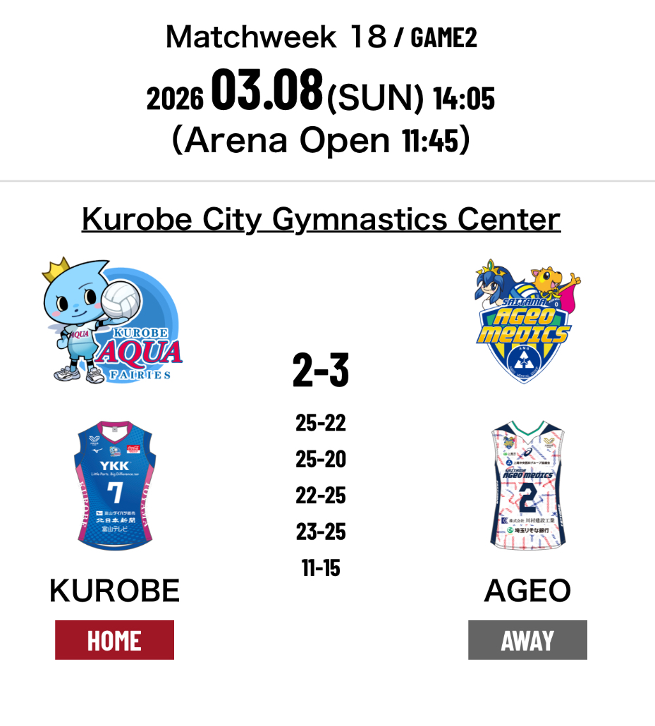 6.Kurobe Aqua Fairies 2-3 Saitama Ageo Medics (25-22 25-20 22-25 23-25 11-15)