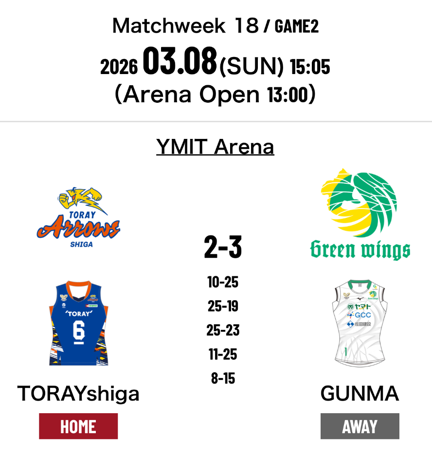 7.Toray Arrows Shiga 2-3 Gunma Bank Green Wings (10-25 25-19 25-23 11-25 8-15)