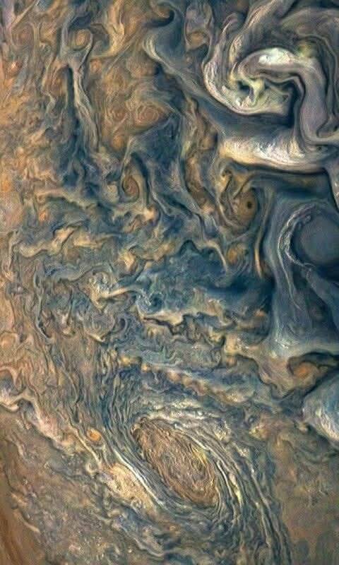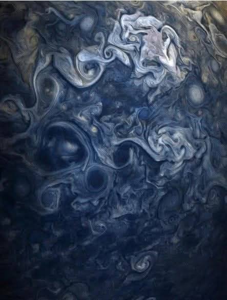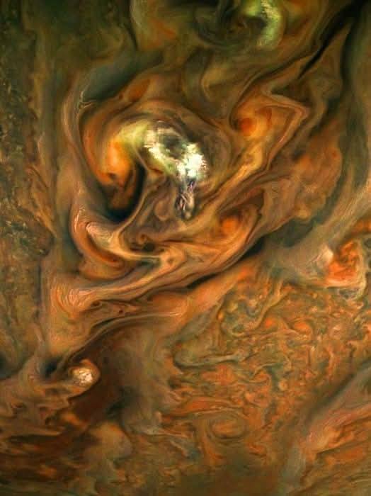 รายละเอียดของเมฆที่ม้วนตัวเหมือนภาพวาดสีน้ำมันแสดงให้เห็นถึงความปั่นป่วนของชั้นบรรยากาศที่ประกอบไปด้วยไฮโดรเจนและฮีเลียมเป็นหลัก