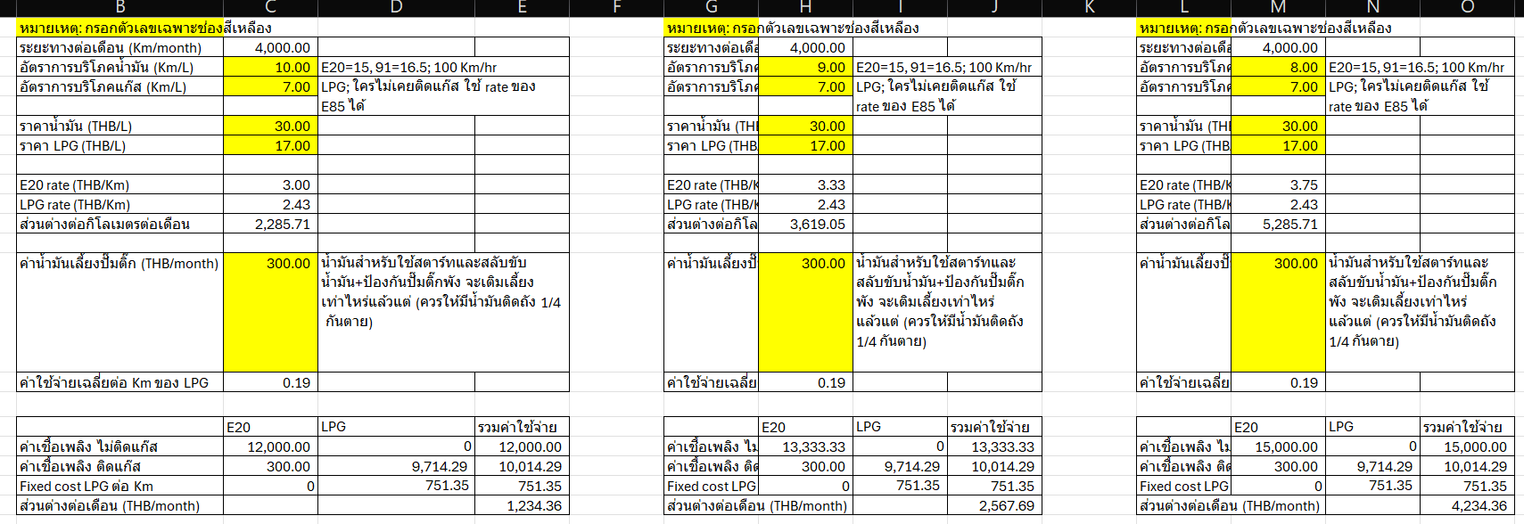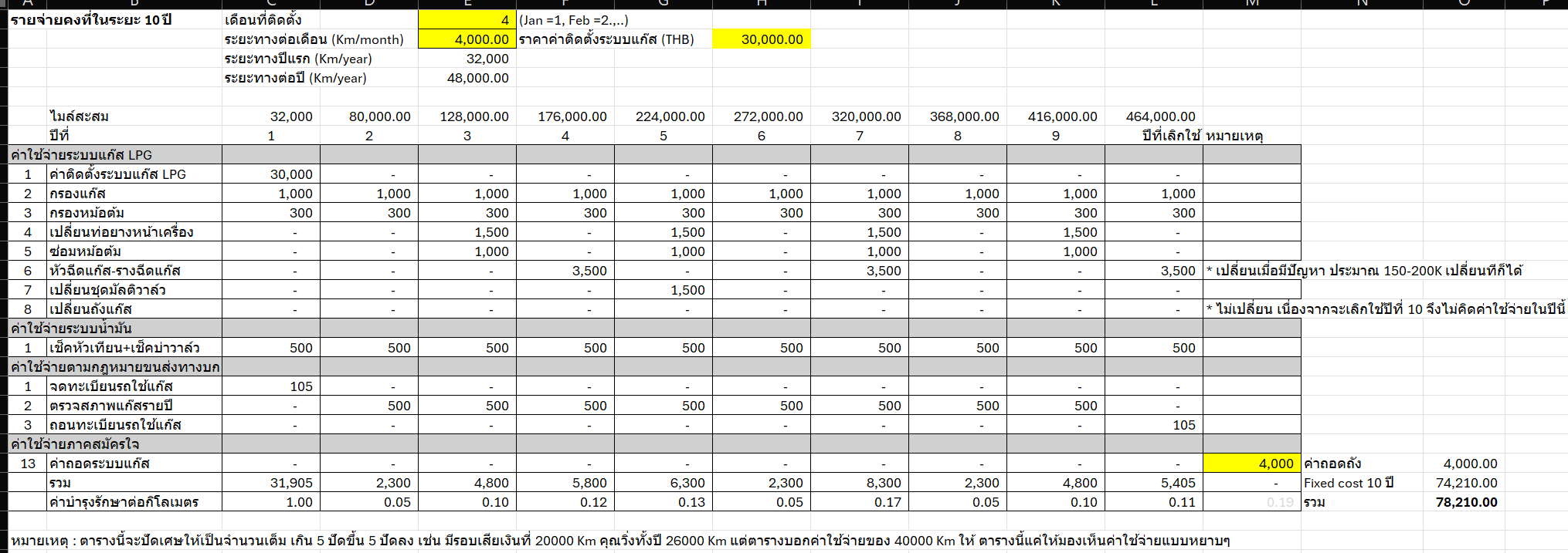 ผมเลยลองคำนวณ Fixed cost ของการติดเเก๊สเล่นๆดู โดยสมมติว่าตัวเองเอารถ 1.5 ที่มีไปติดเเก๊ส จากนั้นคำนวณเงินที่ประหยัดได้ต่อเดือน เเน่นอนว่าขอละเรื่องการซื้อรถ EV เอาไว้ เพราะค่าติดเเก๊สถูกกว่าซื้อรถ EV ทั้งคันเเน่นอน เเค่มาคลี่ให้ดูว่า ถ้าติดเเก๊สจะมีค่าใช้จ่ายอะไรบ้างในระยะเวลาที่ติด ผมติ๊ต่างว่าตัวเองจะใช้รถติดเเก๊ส 10 ปี เเละปรับระยะบำรุงรักษาเป็นระยะที่พิจารณาเเล้วว่า "เหมาะสม" สำหรับตัวผม ใครมองต่าง ก็เข้าไปปรับตัวเลขเล่นๆกันได้ ที่ไฟล์ >> https://www.mediafire.com/file/rssna7b5rhiiaqj/Fixed+cost_LPG_ref+Engine1.5L.xlsx/file