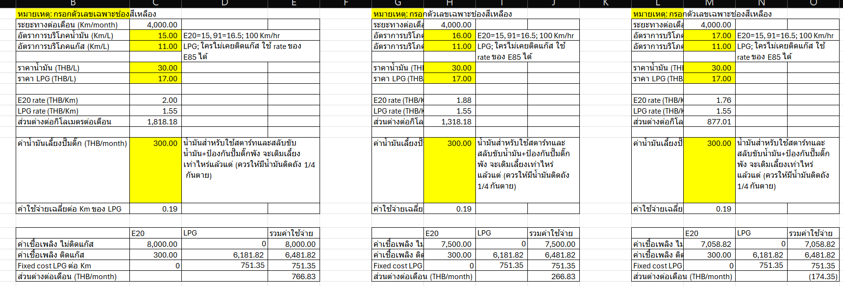 [1.] รถเดิมๆวิ่งน้ำมันได้กี่กิโลเมตรต่อลิตร วิ่งเเก๊สได้กี่กิโลเมตรต่อลิตร (rate เเก๊สใช้ของ E85 แทนได้ พอๆกัน หรือใช้ตัวเลขคลาสสิค 10 Km/L ได้) ร้านติดเเก๊สจะใช้ตัวเลขเท่ากันทั้งน้ำมันเเละเเก๊ส พอคำนวณออกมา ตัวเลขที่เป็นเงินจะสูงเวอร์ แต่ในความเป็นจริงมันไม่ใช่เเบบนั้น เเม้จะเป็นน้ำมัน การใช้ E20 sohol 91, 95 ก็ได้ระยะทางไม่เท่ากัน ตารางนี้จะเอาปัจจัยนั้นมาคิดด้วย
