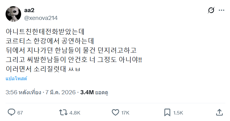 กลายเป็นประเด็นร้อนในโลกโซเชียลทันที เมื่อผู้ใช้งานบัญชี X (Twitter) รายหนึ่งได้โพสต์บอกเล่าเหตุการณ์ไม่คาดฝันที่เกิดขึ้นกับศิลปินหนุ่ม อันกอนโฮ  น้องเล็กจากวงบอยแบนด์น้องใหม่ CORTIS ขณะกำลังทำการแสดงสด (Busking) บริเวณริมแม่น้ำฮัน เมื่อวันที่ 7 มีนาคม 2026 ที่ผ่านมา