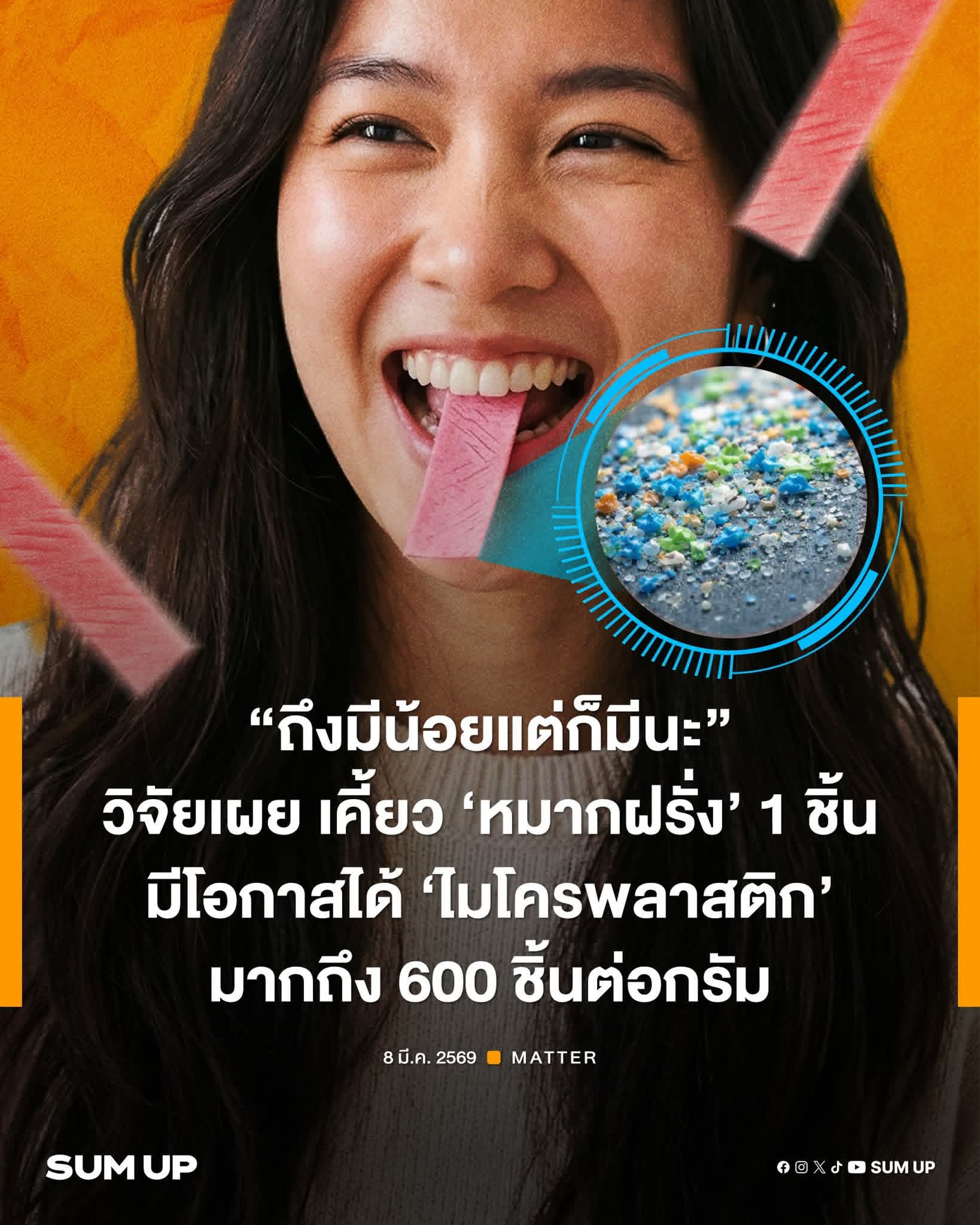 ชอบเคี้ยวหมากฝรั่งกันบ้างหรือเปล่า บางคนเคี้ยวเพื่อให้ปากหอม บางคนเคี้ยวแก้ง่วง บางคนต้องเคี้ยวหลังกินข้าว บางคนเคี้ยวเพราะเชื่อว่ามันจะกระตุ้นสมอง เพิ่มความจำ และลดความเครียดระหว่างการทำงาน แต่เชื่อหรือไม่ว่า การเคี้ยวหมากฝรั่ง 1 ชิ้นอาจทำให้เรามี 'ไมโครพลาสติก' เข้าสู่ร่างกายได้มากถึง 600 ชิ้นต่อกรัมได้เลยนะ