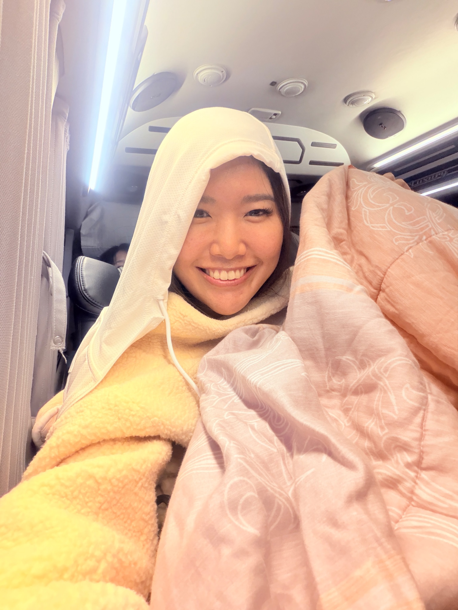 ประมาณ 20.30 น. รถตู้เริ่มออกเดินทาง ในรถหนาวมาก พี่คนขับเลยเอาผ้าห่มมาให้ ไม่งั้นมีแข็งตาย