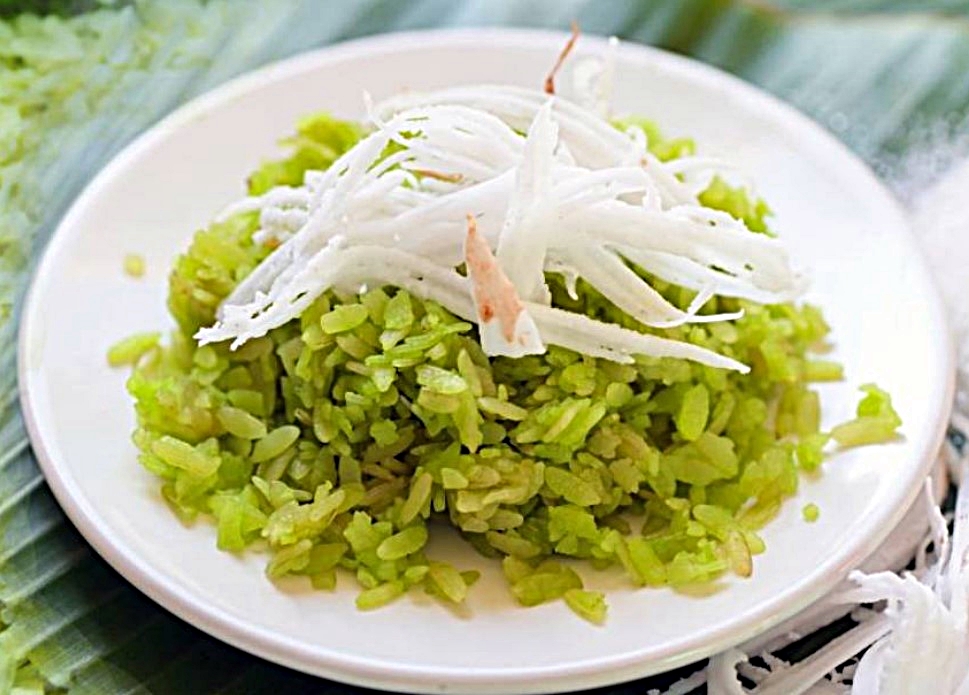 (เพิ่มสีเขียวน่ารับประทานและกลิ่นหอม) ให้เหนียวและแห้ง จากนั้น คลุกกับมะพร้าวแก่