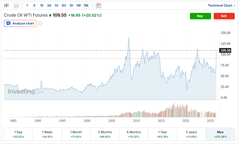 ราคาน้ำมันดิบ WTI ไปขนาดนี้แล้ว ขึ้นมาจากภาวะก่อนสงครามที่ 58 เหรียญ จะแตะ 110 เหรียญแล้ว ขึ้นเกือบ 100% และยังไม่หยุด ปล. ต้นน้ำน่าจะได้ประโยชน์ แต่ปลายน้ำอ่วมแน่ๆ ราคาหน้าปั๊มจะไปถึงไหนหนอ แต่บ้านเ