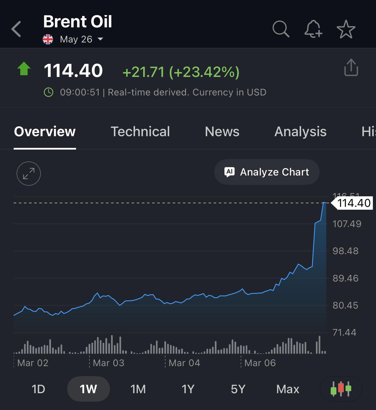 114 ดอลลาร์ต่อบาร์เรล และถ้านับแค่สัปดาห์เดียว ราคาน้ำมันปรับขึ้นไปแล้วกว่า