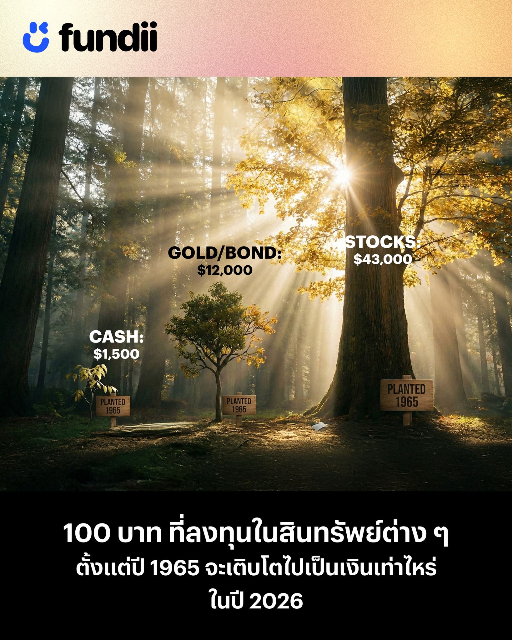 คำตอบคือ… ขึ้นอยู่กับว่าเลือกลงทุนใน “สินทรัพย์” อะไร ถ้าลงทุนยาว 60 ปี จนถึงปี 2026 เงิน 100 บาท จะโตเป็นประมาณ