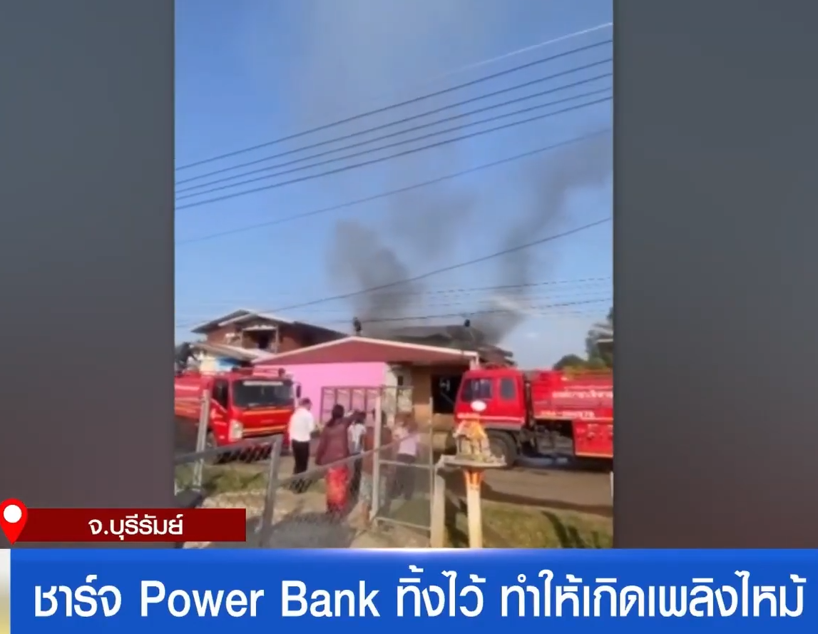 เสียชาร์จพาวเวอร์แบงก์ทิ้งไว้ เป็นภาพขณะรถดับเพลิงเข้าดับเพลิงที่ลุกไหม้บ้านหลังหนึ่ง ในพื้นที่บ้านโคกสะอาด