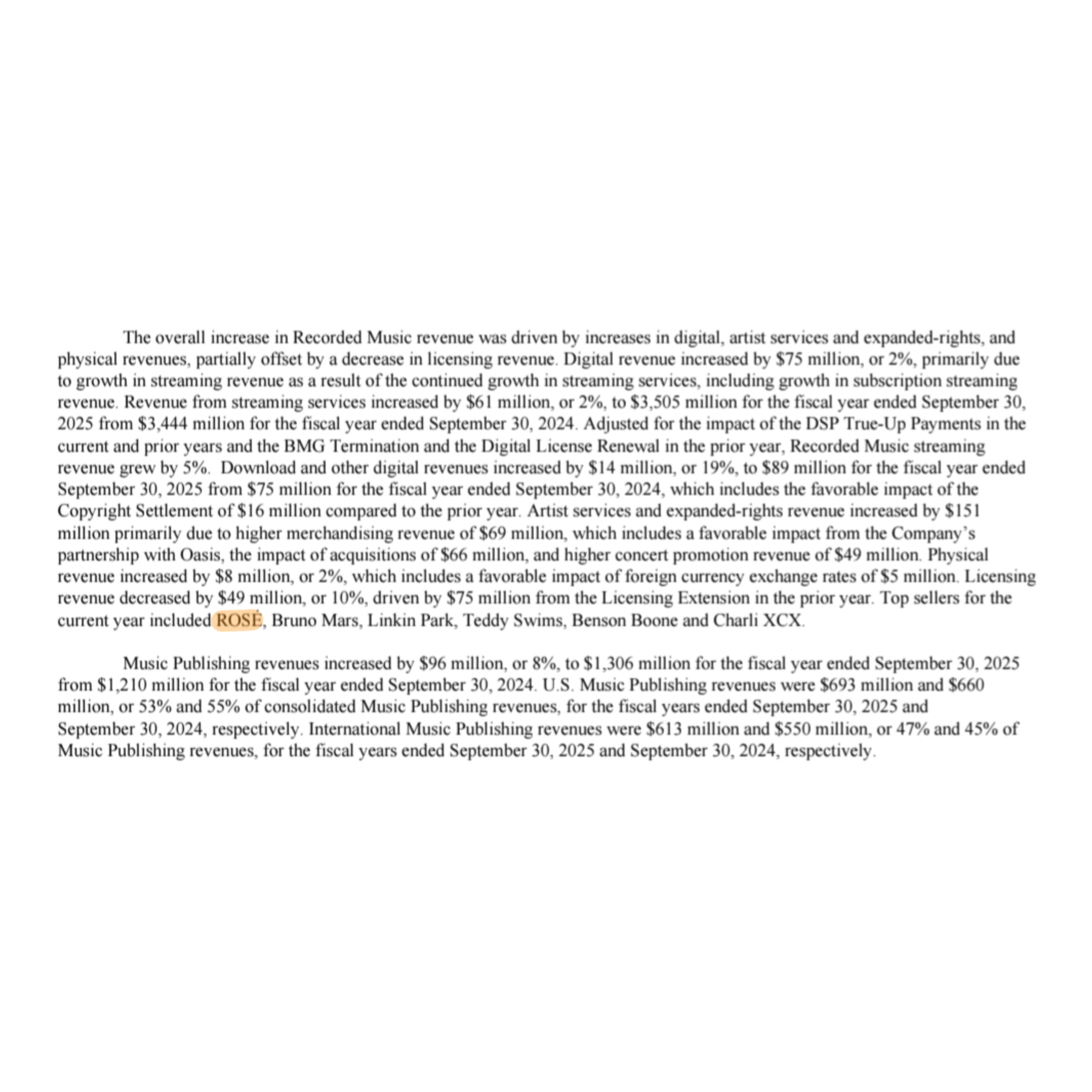 ในรายงานประจำปีของ Warner Music Group ว่า ROSE คือศิลปินที่ทำรายได้สูงสุดเคียงข้าง Charlie XCX, Bruno Mars, Benson Boone