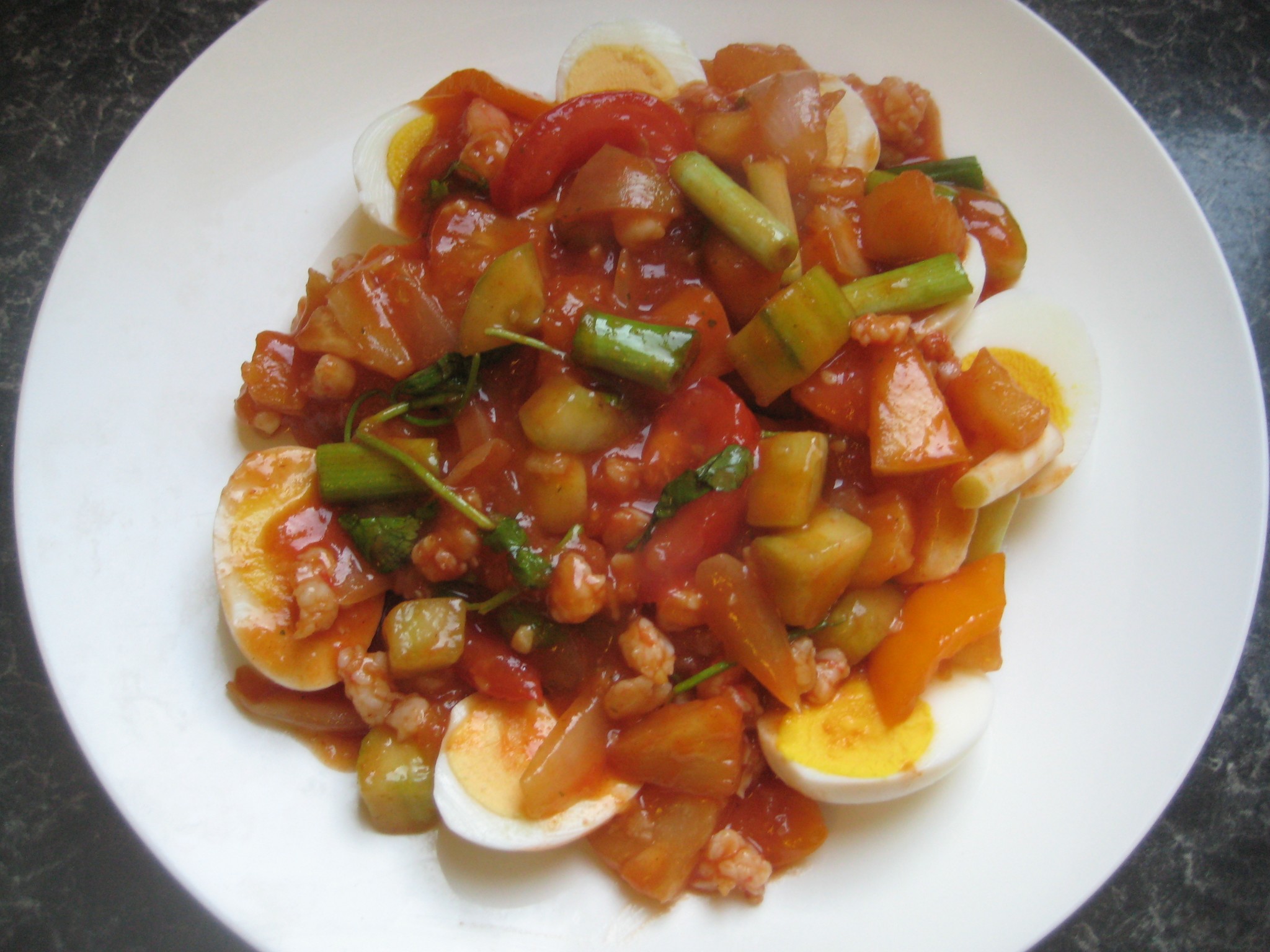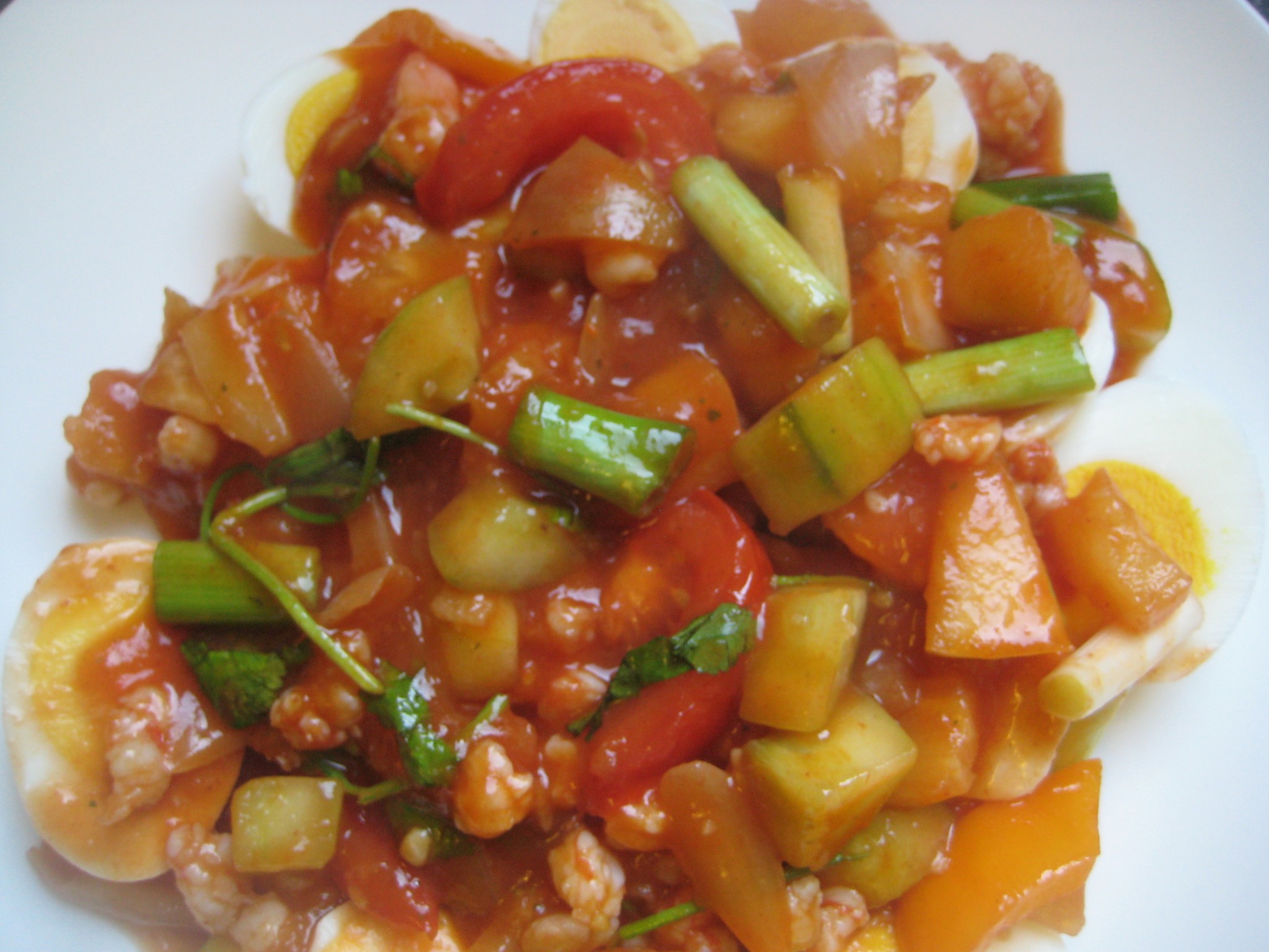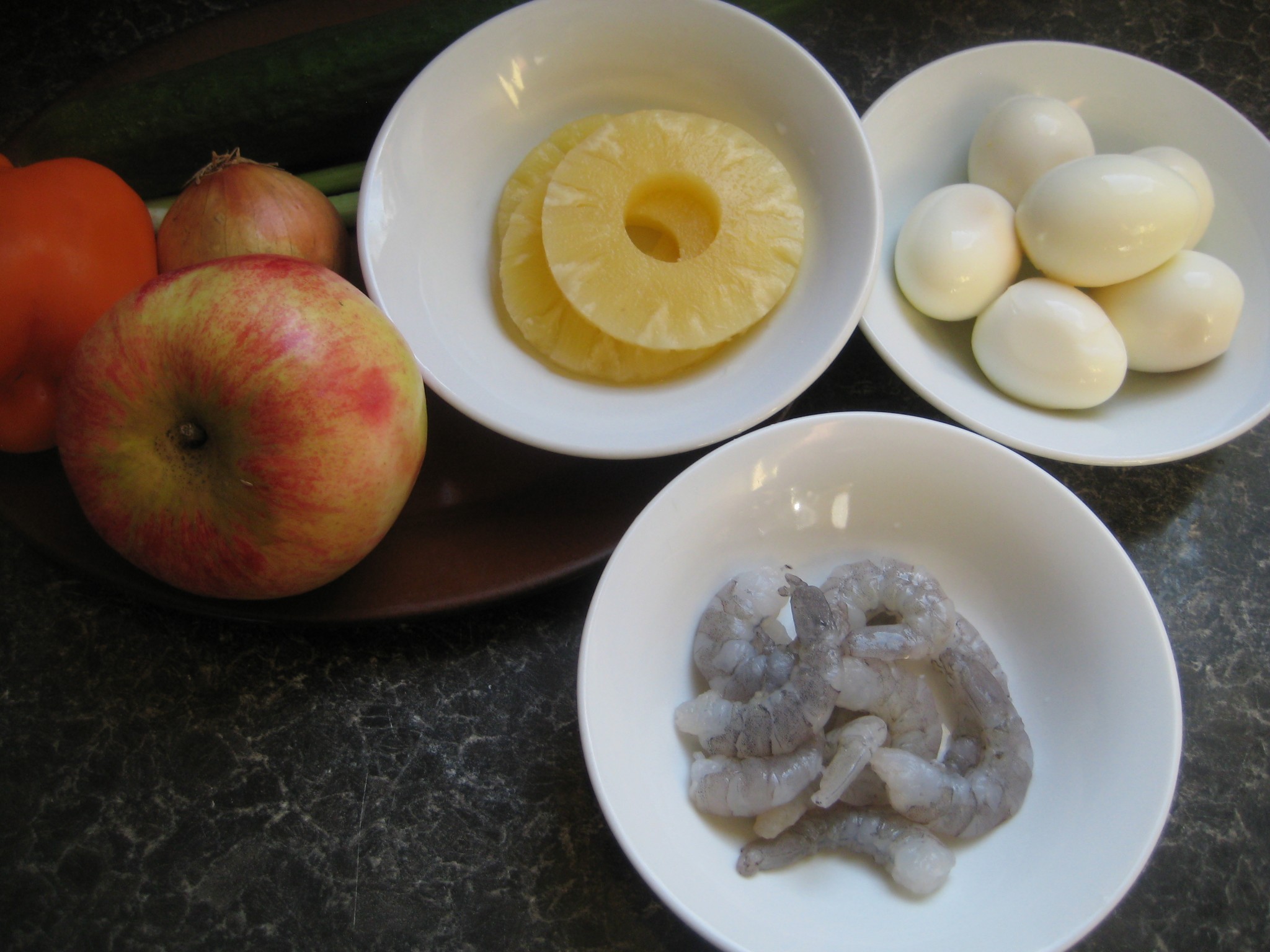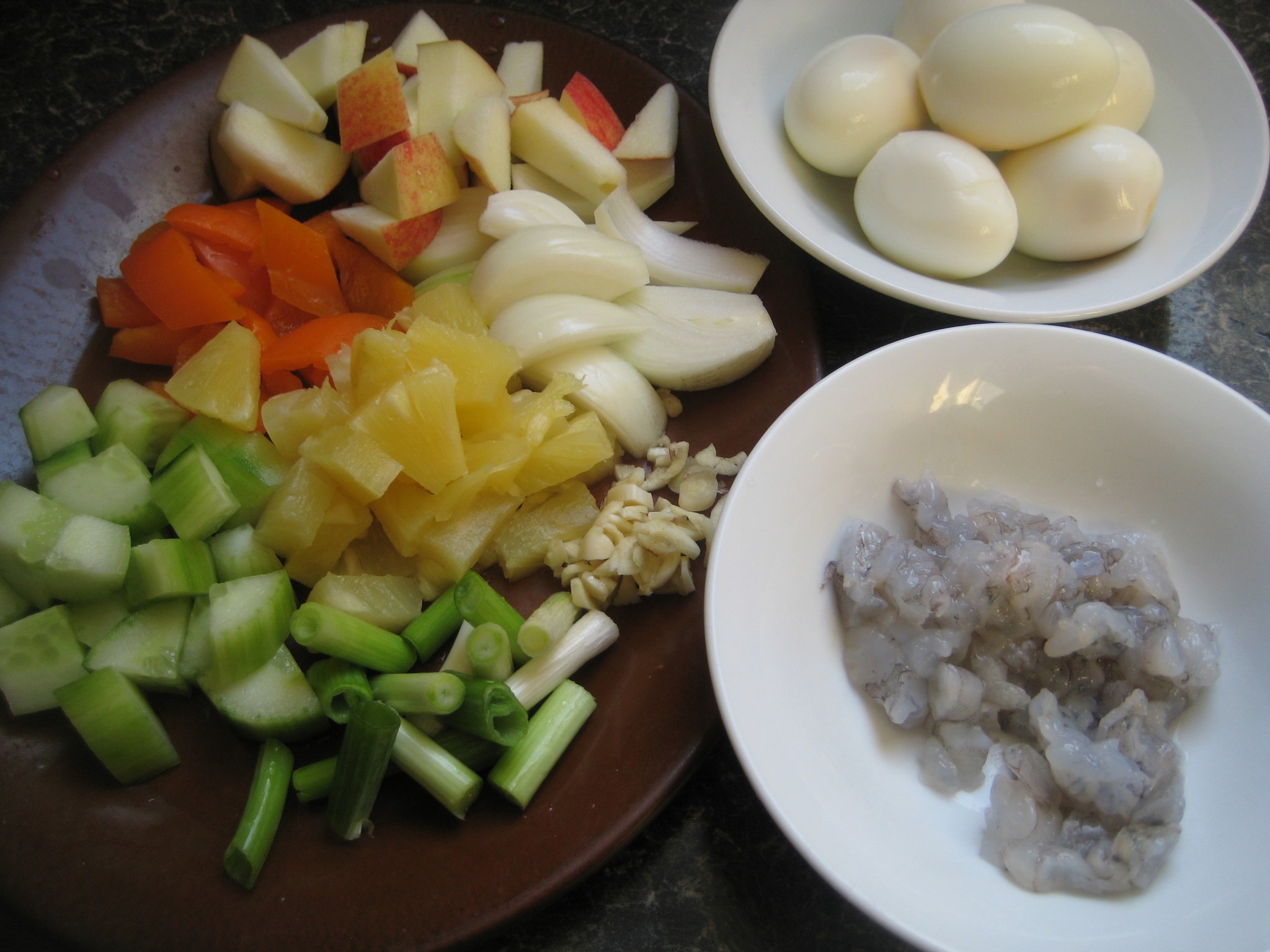 ส่วนผสม ไข่ไก่ กุ้งสด พริกหวาน หอมใหญ่ กระเทียมสับ สับปะรด แตงกวา มะเขือเทศ แอปเปิ้ล ต้นหอม ผักชี