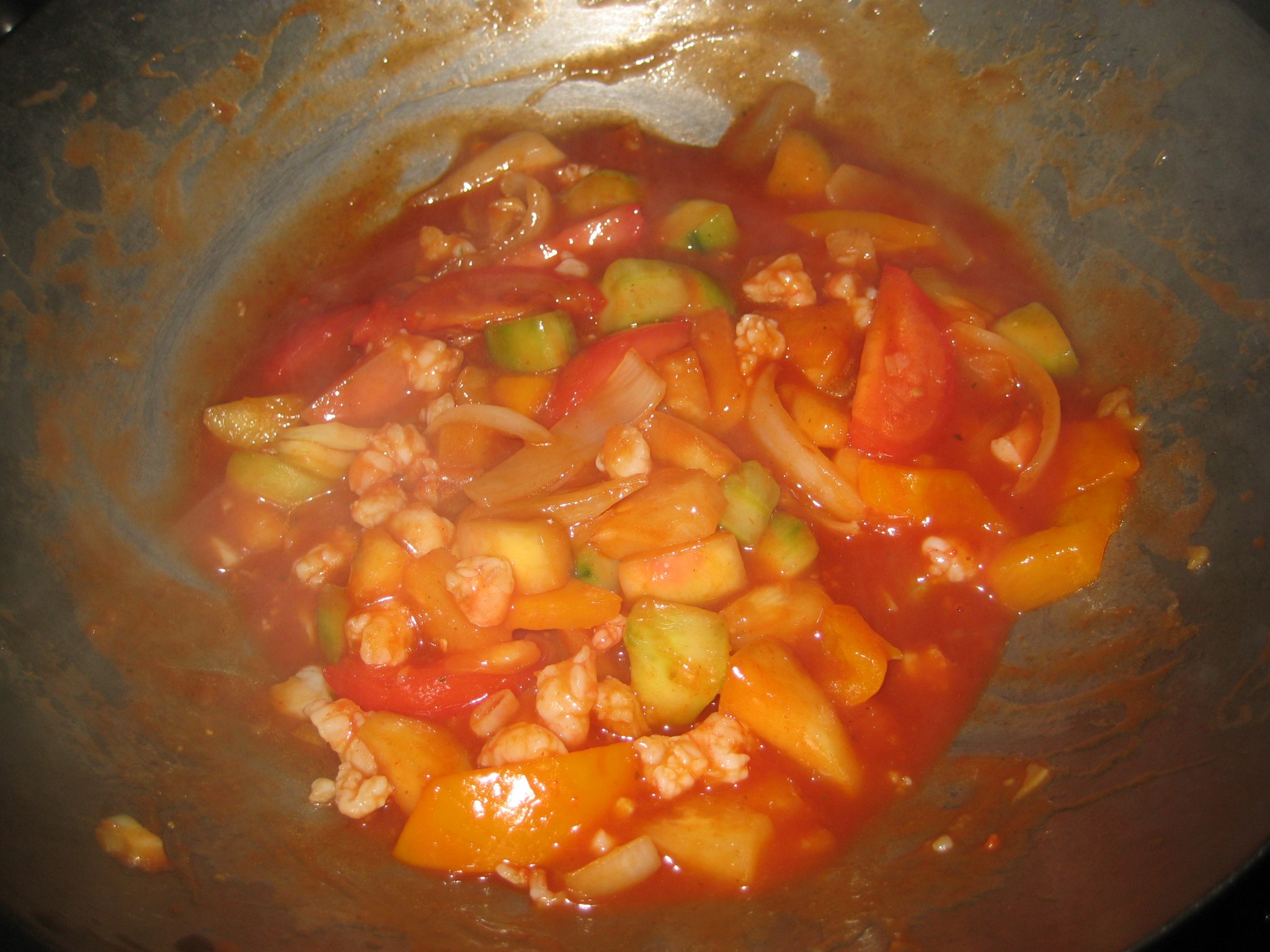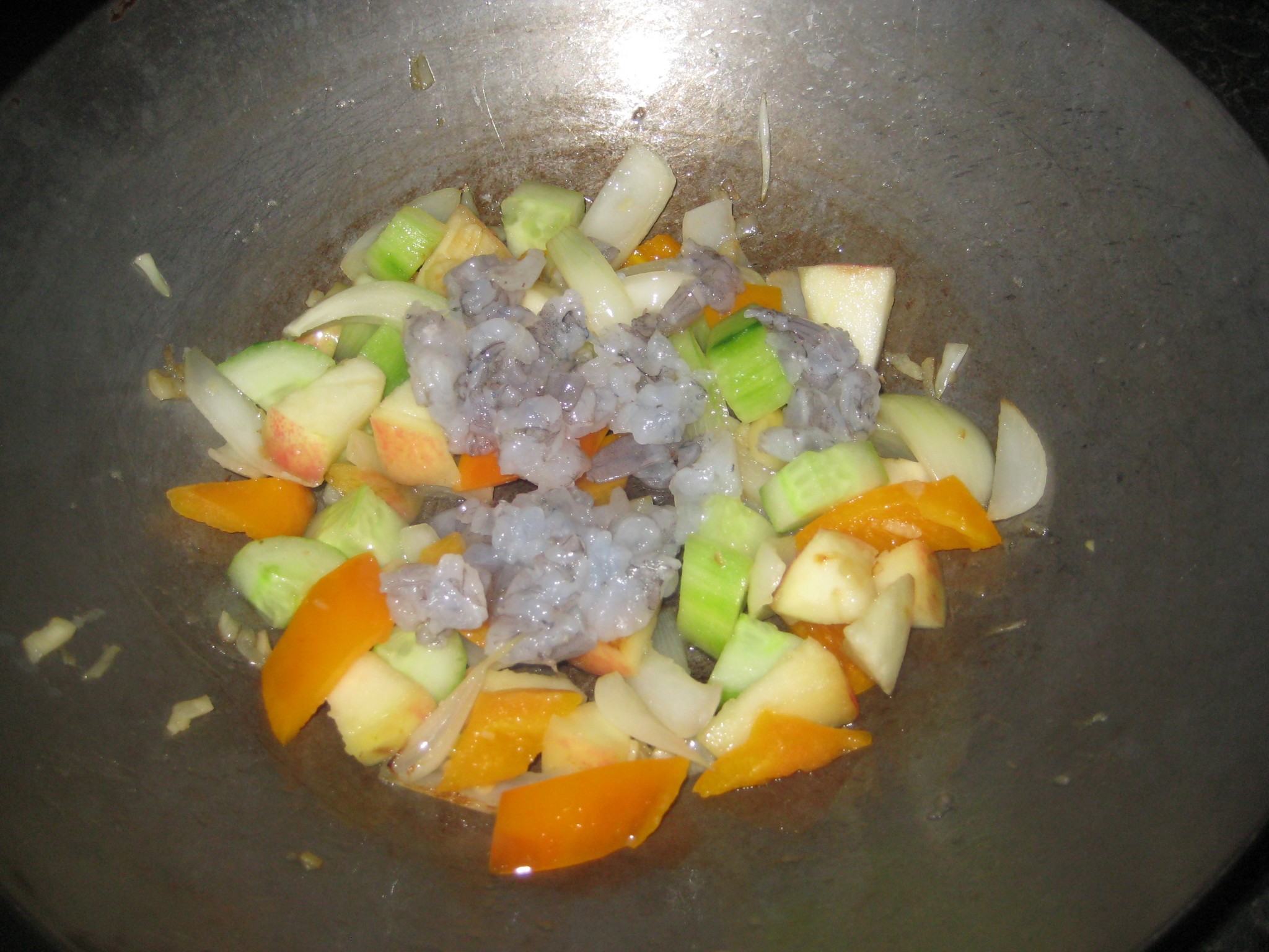 ใส่หอมใหญ่ลงผัดให้เข้ากัน ใส่แตงกวา พริกหวาน แอปเปิ้ลลงผัดให้พอเริ่มสุก ใส่เนื้อกุ้งสับลงไปผัดเกือบสุก