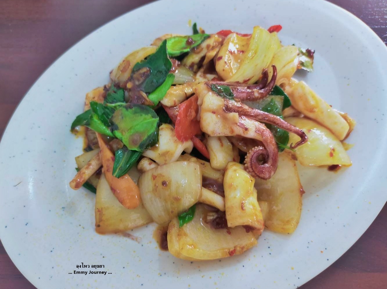 ปลาหมึกน้ำพริกเผา ราคา 150 บาท รสชาติหวานน้ำ ไม่เผ็ด