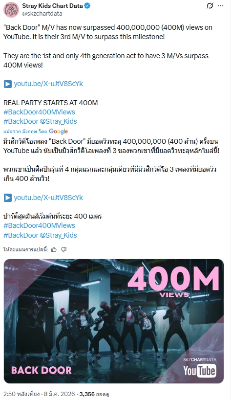 🔥 Stray Kids "Back Door" มียอดวิวบน YouTube ทะลุ 400,000,000(400 ล้าน) ยังเป็นอันดับ1เจน4 ที่มี MV 3 เพลงเกิน 400 ล้าน!