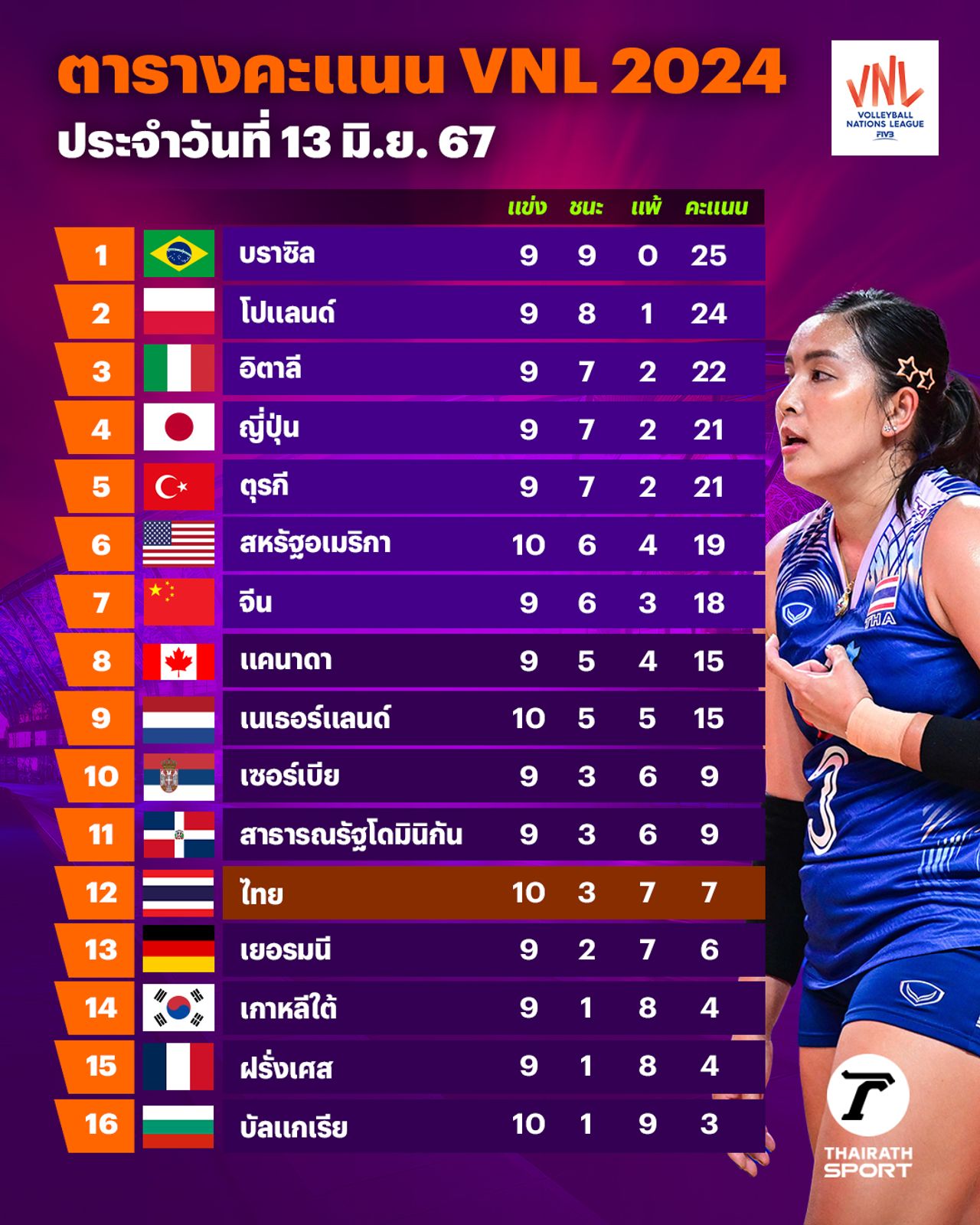 FIVB Women’s Volleyball Nations League 2024 แข่ง 12 นัด ชนะ 3 แพ้ 9 จบอันดับ 13 ของรายการ