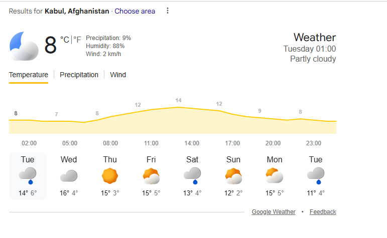 ตอนนี้คาบูล 8 องศา ต่ำสุด 6 สูงสุดตอนกลางวันแค่ 14 องศาเอง