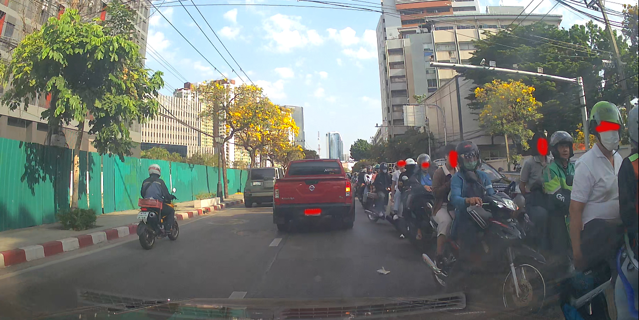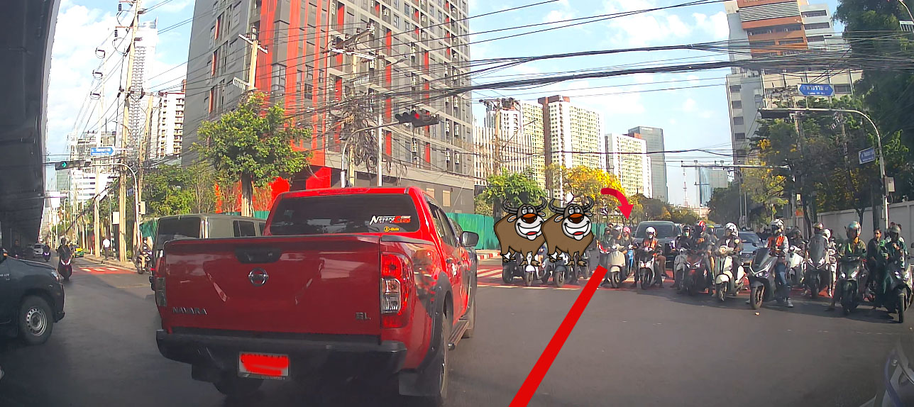 รถติดไฟแดงแต่พวกพี่ๆ ทั้งหลายไม่ยอมต่อแถว เล่นเปิดเลนส์พิเศษขวางอีกฝังเพื่อที่จะได้ออกตัวตอนไฟเขียว