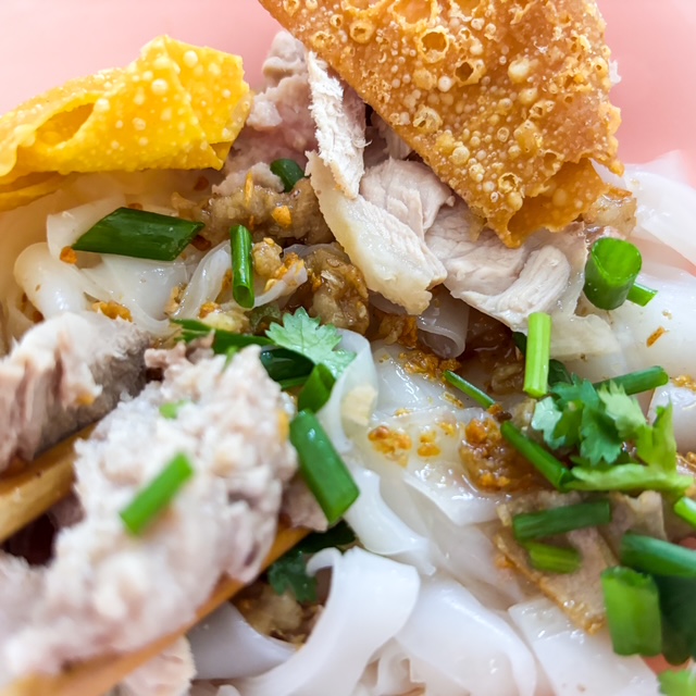 ก๋วยเตี๋ยวชามละ 40 บาท ก็ไม่ได้มีอะไรที่หวือหวา หรือเครื่องพิเศษอะไร แต่เป็นก๋วยเตี๋ยวแบบโบราณๆ รสชาติแบบเดิมๆ ยังคงเป็นน้ำมันหมูใส่กากหมู ที่แกจะเจียวเอง เอาหนังหมูมาแล่แล้วเจียวเอง ร้านแกจะอยู่เยื้องๆ ธนาคารออมสิน ศรีราชา จะมีคล้ายๆ กันสองร้าน ก็สังเกตป้ายผัดไทย หอยทอดดูเอานะครับ