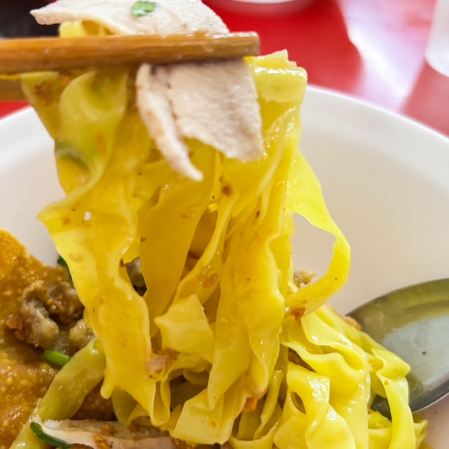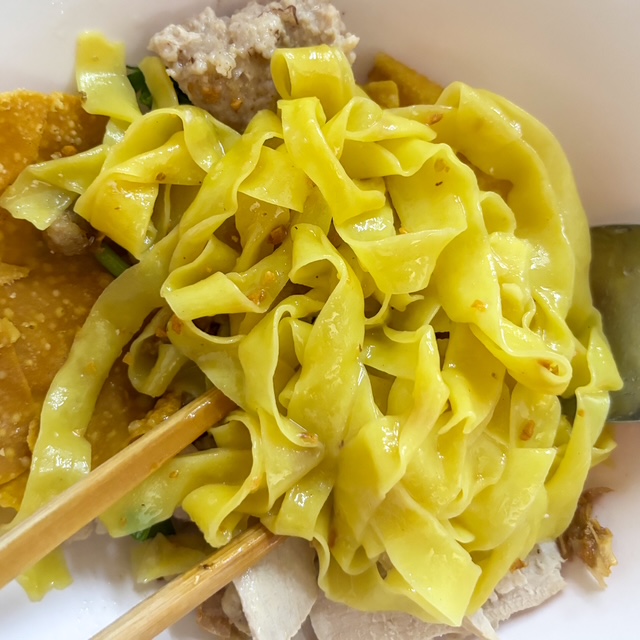 บะหมี่เป๊าะแบบเส้นใหญ่มีความกรุบในแบบเดิมๆ ที่ไม่ใช่บะหมี่ไข่แบบสมัยนี้ กลิ่นด่าง กับเส้นแบบนี้ คือแบบดั้งเดิม และสำหรับเส้นใหญ่ที่ไม่ใช่แป้งมัน คนเส้นใหญ่คงรุ้ว่า ถ้าเอาเส้นใหญ่แห้ง คลุกกับน้ำมันหมู นั่นคือที่สุดของที่สุดจริงๆ ไม่ต้องปรุงแต่งอะไรมากมายเลย น้ำปลา นิ๊ดเดียวก็เพียงพอแล้ว กลิ่นหอมน้ำมันหมู กับกระเทียม มันคนละเรื่องกับน้ำมันพื่ช