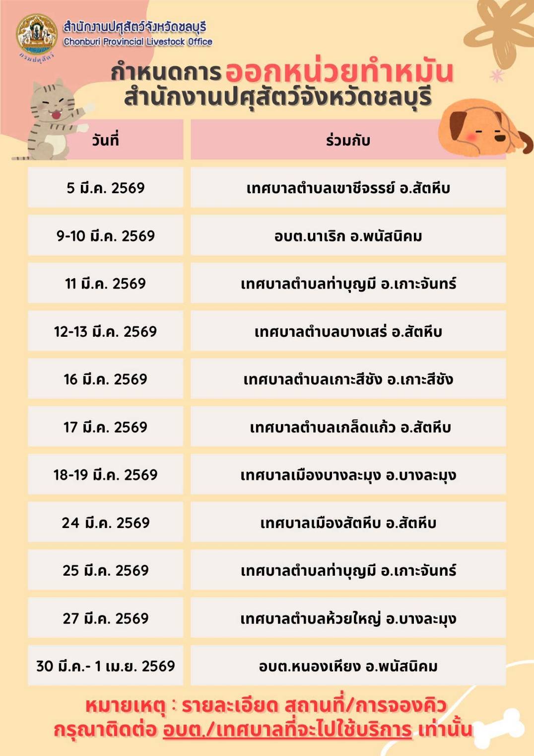 ปศุสัตว์ชลบุรี บริการทำหมันและฉีดวัคซีนสุนัขและแมว ประจำเดือนมี.ค.69 ค่ะ รายละเอัยดตามตารางเลยค่ะ
