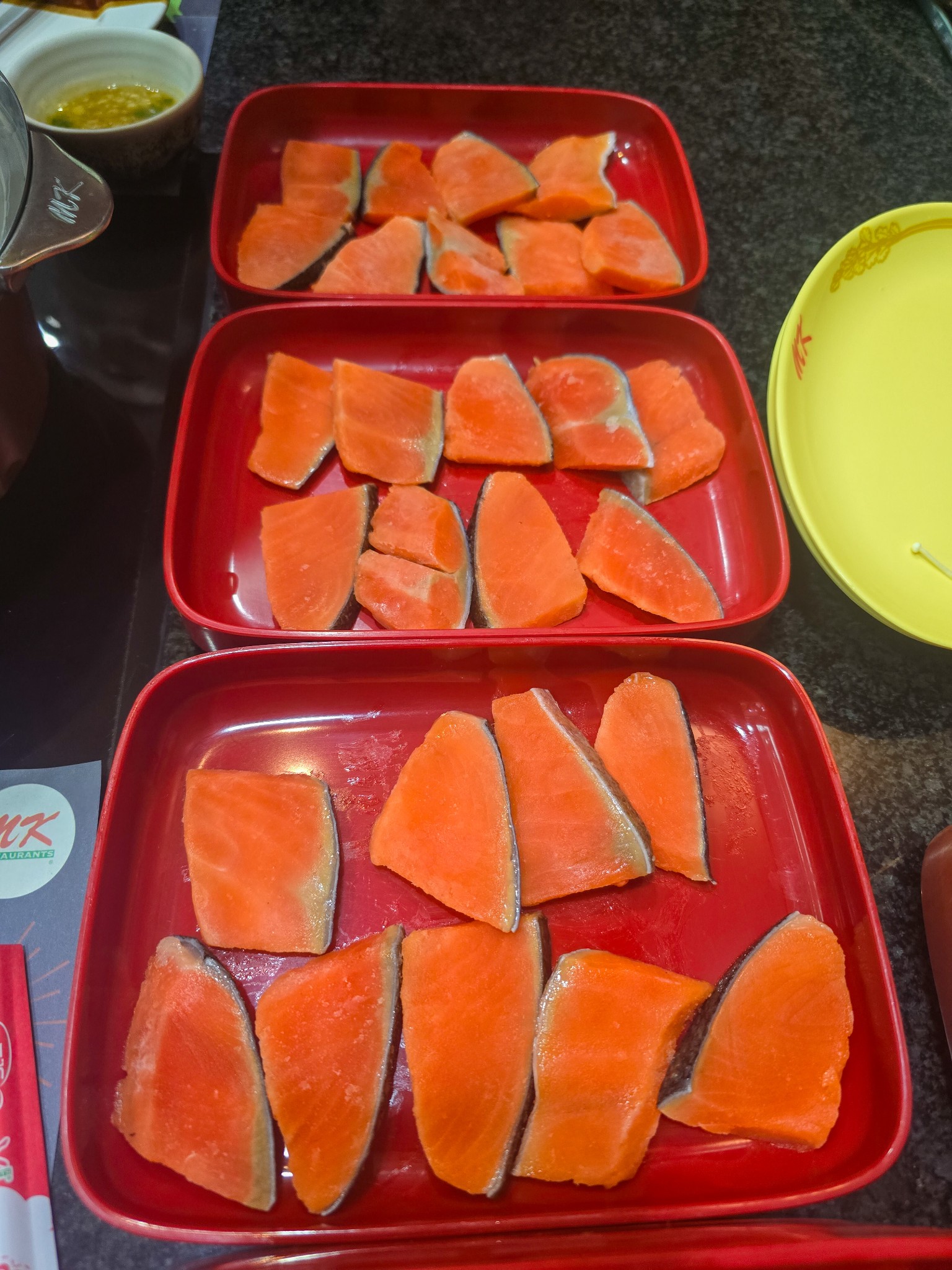 แซลมอน: มาแบบ Frozen เกรดสำหรับต้มนะครับ สีส้มแปร๊ดสะใจมาก เนื้อแน่นดีครับ ลวกแล้วไม่แตกกระจายในหม้อ ส่วนตัวมองว่าคุณภาพและสีสันใกล้เคียงกับของ BarBQPlaza ที่เปิดโปรวันนี้เหมือนกันเป๊ะเลยครับ