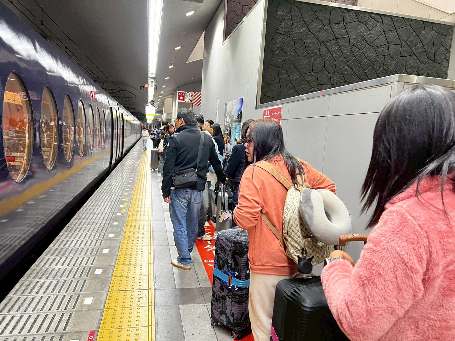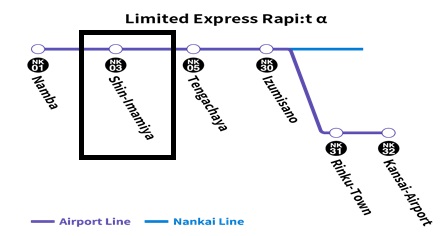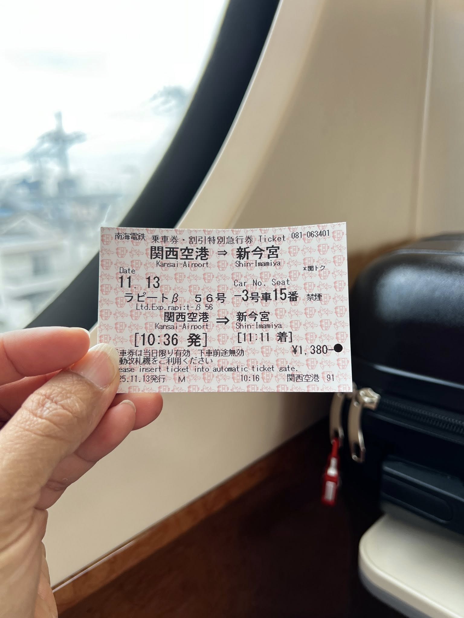 พวกเราเลือกเดินทางเข้าเมืองด้วยรถไฟสาย Nankai จองที่นั่ง (ซื้อที่เค้าท์เตอร์ Nankai Kansai Airport) ลง สถานี Shin-Imamiya นั่งต่อเดียวถึงค่ะ ที่เลือกสาย Nankai เพราะ โรงแรมที่พวกเราพักเดินออกจากสถานีข้ามถนนก็ถึงเลยค่ะ ใช้เวลาเดินทาง 35 นาที ก็ถึงสถานี Shin-Imamiya ค่ะ