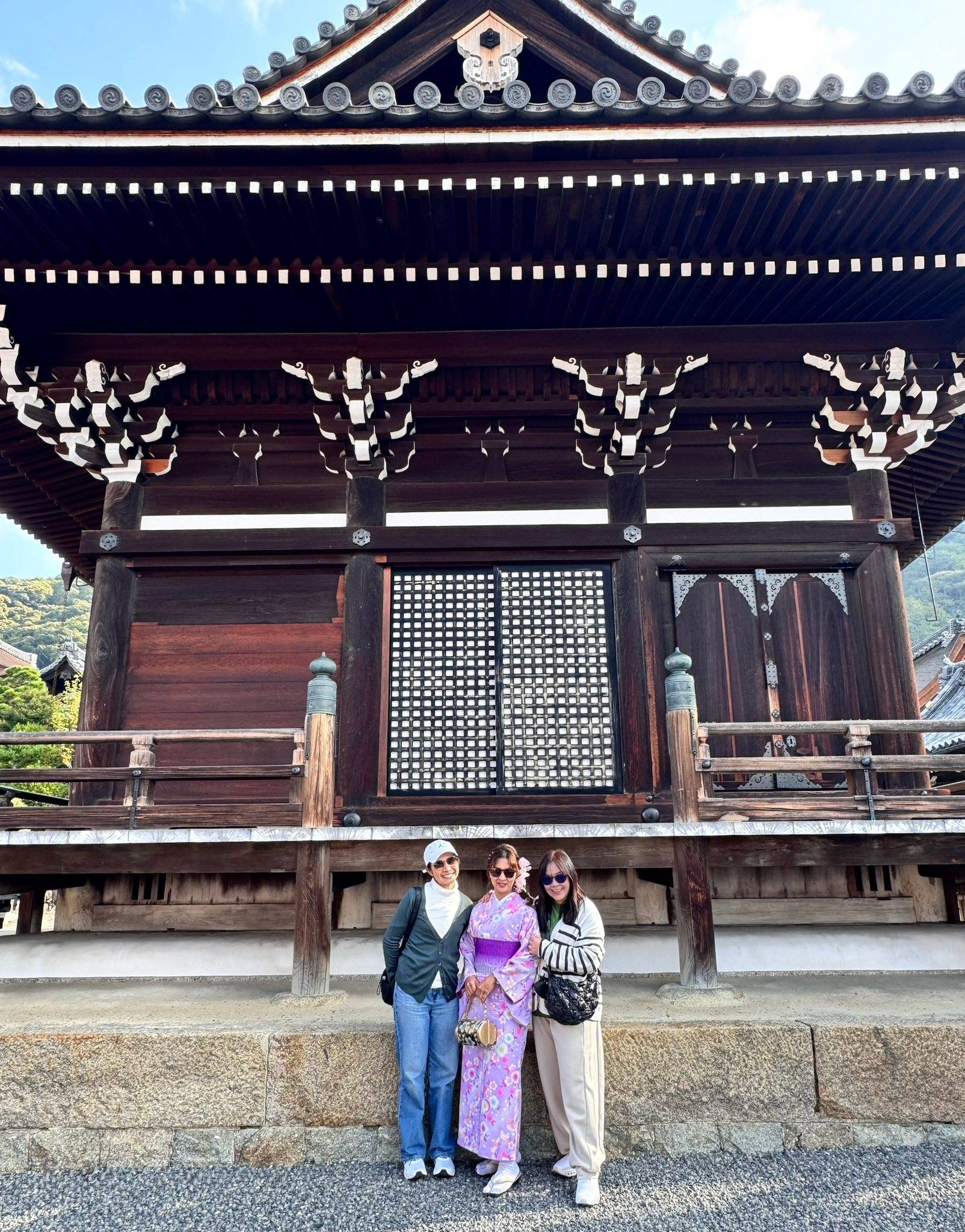 ก่อนเข้าวัด พี่สาวที่ไปด้วยอยากใส่กิโมโนเลยแวะร้านก่อนทางเข้าวัด เช่าชุดกิโมโนค่ะ เจ้าของกระทู้กับน้องอีกคนเคยใส่แล้วเลยไม่เช่า จัดให้พี่สาวเต็มที่ค่ะ ร้านที่เช่าสังเกตุได้ง่าย ตรงป้ายบัส Gojozaka เดินข้ามทางม้าลาย ร้านจะอยู่ซ้ายมือติดถนนค่ะ ราคาไม่แพง ชุดสวยด้วย เบ็ดเสร็จพี่สาวจ่ายไป 4,000 เยน ชุด+ทำผม (แถมพร็อฟเลือกได้ 1 อย่าง) ชื่อร้าน "OOKINI KIMONO"