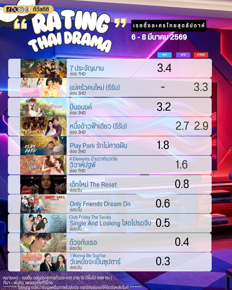 ส่วนเรตติ้งละคร/ซีรีส์สุดสัปดาห์ ประจำวันที่ 6-8 มีนาคม 69 ได้ 0.8