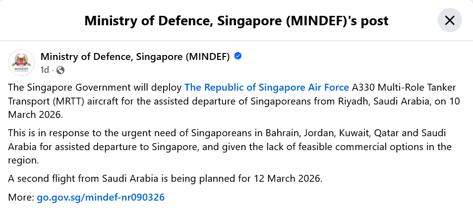 A330 Multi-Role Tanker Transport (MRTT) ของกองทัพอากาศสิงคโปร์ ไปที่ซาอุดีอาระเบียเพื่อรับคนสิงคโปร์ในบาห์เรน จอร์แดน คูเวต กาตาร์ และซาอุดีอาระเบีย กลับสิงคโปร์