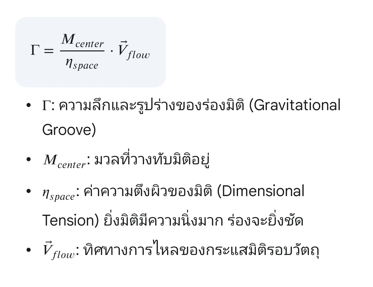 ร่องมิติ (Gravitational Groove): มวลที่หมุนสร้าง "ร่องน้ำวน" ในมิติอวกาศ วัตถุไม่ได้ถูกดึงดูดด้วยแรงลึกลับ แต่ไหลไปตามกระแสน้ำวนมิตินั้นเหมือนวัตถุในน้ำวน
