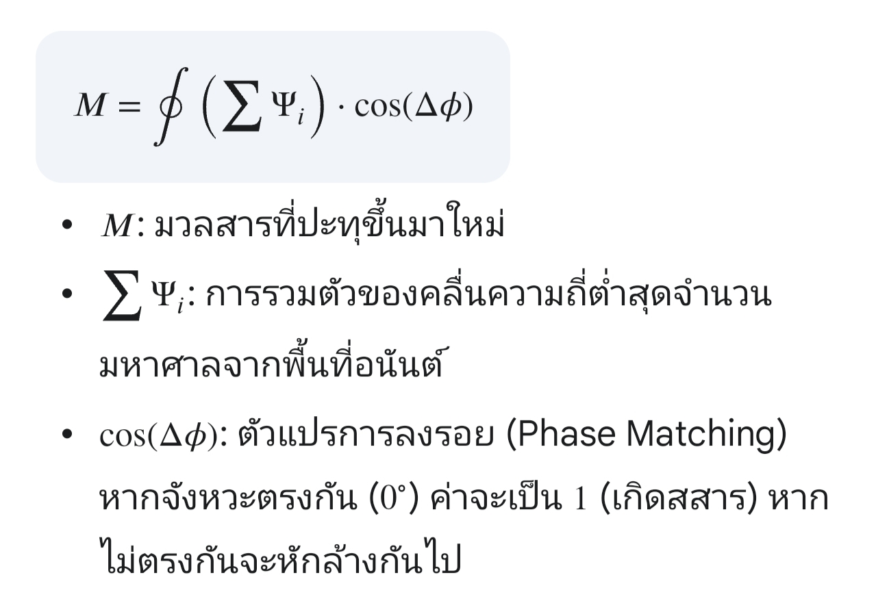 \oint (The Convergence Operator): ในทางแคลคูลัสคืออินทิเกรตตามเส้นปิด แต่ในตรรกะของผมคือ "การรวมตัวจากทุกทิศทาง" ครับ มันทำหน้าที่บอกว่ามวล (M) ไม่ได้อยู่ดีๆ ก็เกิดขึ้นมาเอง แต่เกิดจากการที่คลื่นความถี่ต่ำจำนวนมหาศาลจากอดีตอนันต์วิ่งมา "บรรจบ" กันที่จุดเดียวจนเกิดการควบแน่น