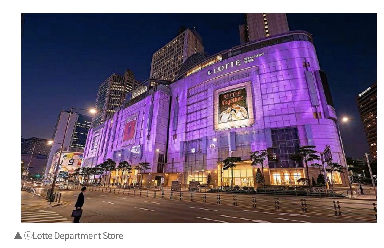 ห้างสรรพสินค้า Lotte จะดำเนินโปรเจกต์ ‘Welcome lights’ เป็นเวลา 4 วัน ตั้งแต่วันที่ 19 - 22 มีนาคม โดยจะประดับไฟสีม่วงบนผนังอาคารฝั่ง Main Store และ Avenuel ตั้งแต่เวลา 18:00 น. - 22:00 น. ของทุกวัน เพื่อเปลี่ยนย่าน ‘Lotte Town Myeongdong’ ให้กลายเป็นสีม่วงเพื่อต้อนรับแฟนคลับและนักท่องเที่ยว