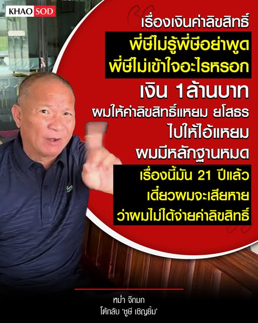 ไปหักอะไร กูไม่ทราบ พี่ษีไม่เข้าใจอะไรหรอก พี่ษีอย่าพูดเลย พี่ไม่รู้ 1ล้านบาทผมให้ค่าลิขสิทธิ์แหยม ยโสธร ไปให้แหยม ผมมีหลักฐานหมด