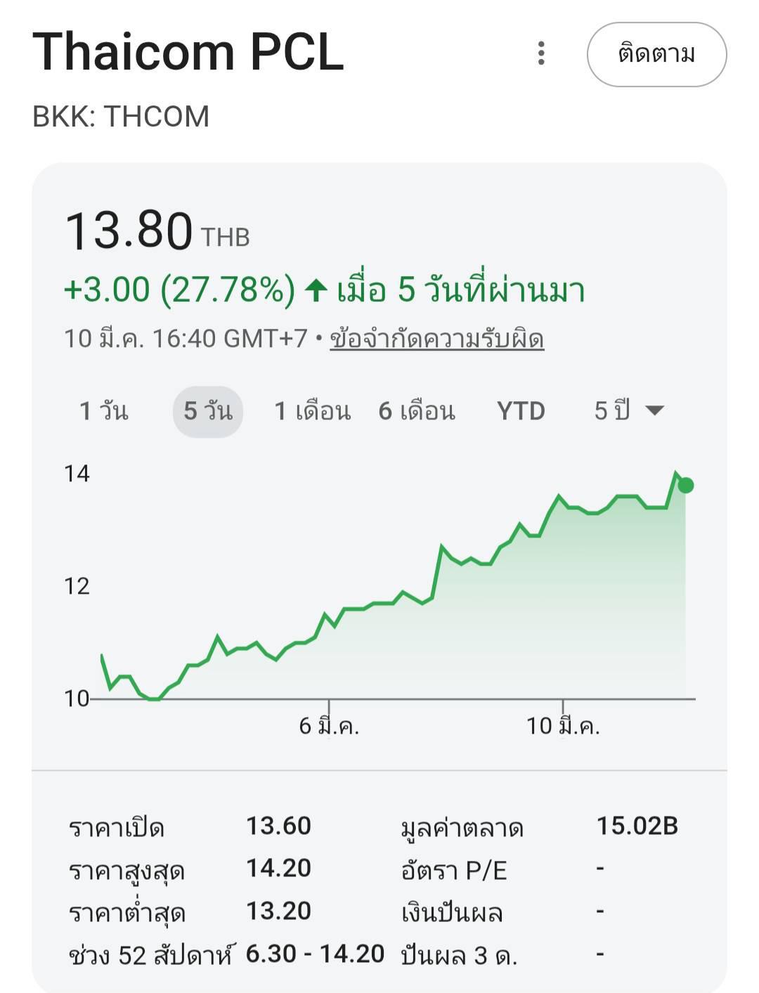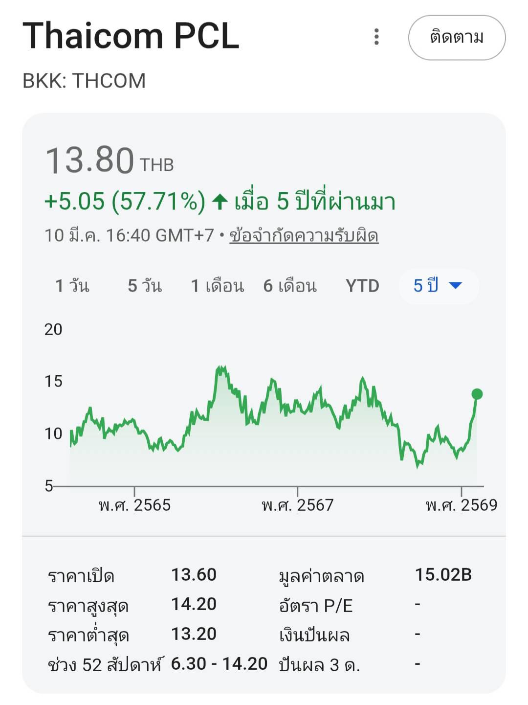 จับตา thcom ... ราคาทะลุ 14 บาทไปแล้ว มาปิดที่ 13.8 ถ้าไปต่อทะลุ 16 บาทได้ จะเป็นหุ้นที่ไร้แนวต้านสำคัญเลย