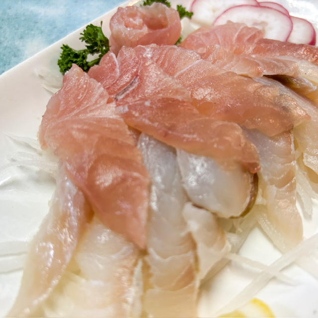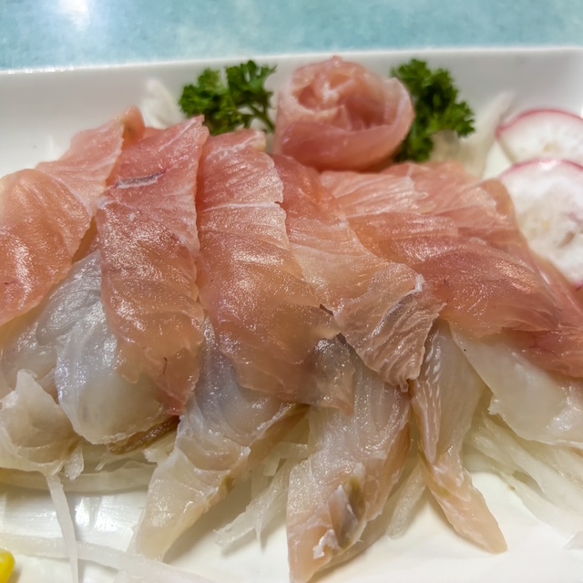 ไต๋หรือพ่อครัว ใจดีมากมาย อัธยาศัยดีมาก ดีมากจริงๆ แกบอกวันนี้มาปลาแชกำกับปลามงอะไรสักอย่าง ก็เลยลองสั่งมาดู เป็นซาซิมิปลาไทย สองอย่าง