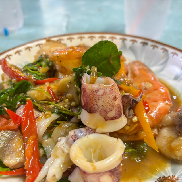 ส่วนตัวกับวัตถุดิบ ฟิลลิ่งบรรยากาศในการกินแบบนี้ รสชาติอาหาร เราอาจจะหาอาหารทะเลสดๆ ได้ไม่ยากตามร้านริมทะเลแถวๆ นี้ที่มีเยอะแยะมากมาย แต่ส่วนตัวผมชอบร้านสไตล์บ้านๆ แบบนี้ และบรรยากาศวุ่นวายของคนในครอบครัว ที่กำลังวุ่นวายกับการเตรียมอาหาร จัดอาหาร ที่ไม่ได้เป็นแบบมืออาชีพ เป็นความตรงไปตรงมา เป็นความวุ่นวายที่ดูแล้วอบอุ่น คนคิดเงินก็ยังงงๆ ต้องถามราคาไต๋ การเได้เห็นคนในครอบครัว ถกเถียง ของโต๊ะนั้น โต๊ะนี้ นี่คือ บรรยากาศที่ผมชอบเป็นการส่วนตัวจริงๆ อยากให้คนที่ชอบอาหารสไตล์แบบนี้ ลองแวะมาอุดหนุนกันได้