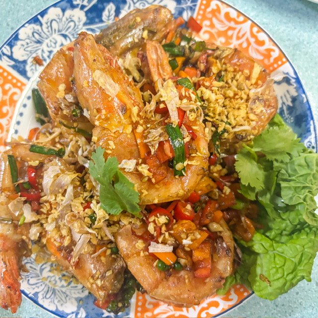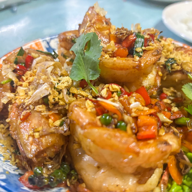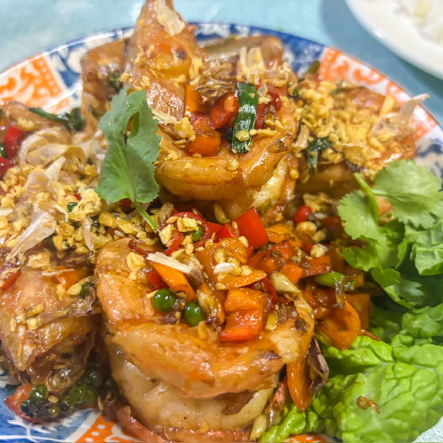จานสุดท้าย กุ้งคั่วพริกเกลือ กุ้งตัวใหญ๋มากจริงๆ จานนี้ 300 บาท ดุเหมือนเผ็ดแต่ก็ไม่เผ็ด แต่ถ้ากินพริกก็คงเผ็ด