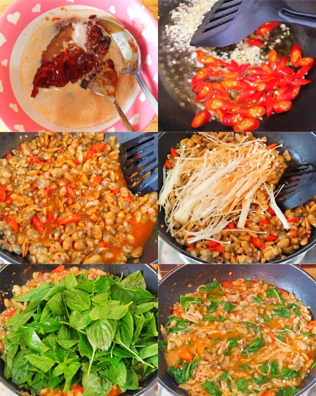 3. ใส่ซอสที่ผสมไว้ลงไปผัด แล้วตามด้วย หอยลาย