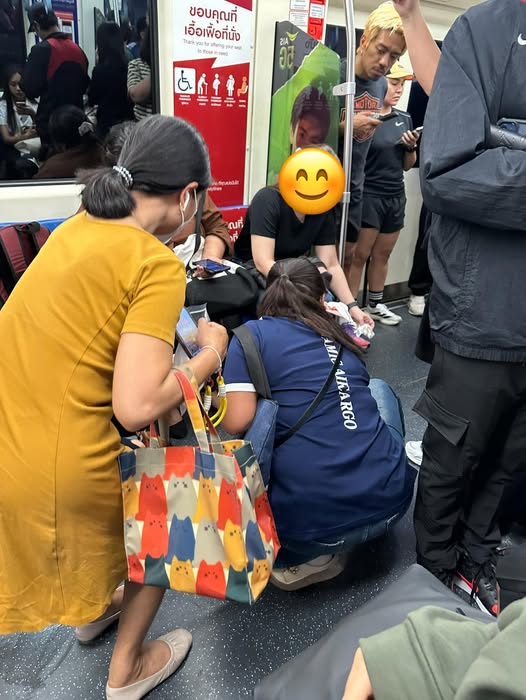 มีคนนึงขึ้นรถไฟฟ้า เสียบแก้วกาแฟไว้ข้างกระเป๋า