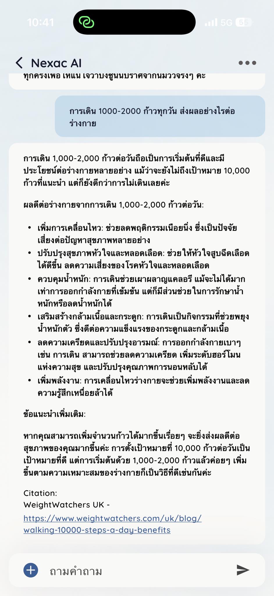 ซึ่งดิฉันก็ถาม Nexac AI มาว่าประโยชน์มีอะไรบ้างจากการเดินเพียงเท่านี้ มันก็บอกมาแบบนี้ค่ะ ก็ถือว่าค่อนข้างตรงกับสิ่งที่ดิฉันรู้สึกจริง ๆ